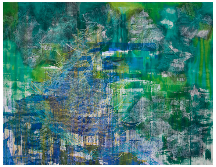 Alt text long description: An abstract painting dominated by vibrant green and blue hues with an overlay of intricate line patterns. The background features blended shades of green, ranging from bright lime to deep forest green, interspersed with patches of lighter and darker tones. Overlaying this background are numerous white lines creating geometric and organic shapes, reminiscent of leaf and web-like structures. These lines form complex patterns that add a sense of depth and texture to the painting. Some areas highlight a slight presence of yellow and hints of teal, contributing to the dynamic composition. Note: the alt text was written with support from the ASU Image Accessibility Creator AI tool.