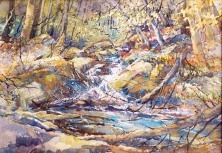 Mossy Promenade by Carla Niehaus  Image: Alt text long description: A watercolor painting of a forest creek. In the foreground, a tranquil stream flows over rocks, creating a gentle, rhythmic pattern. The water reflects various hues of blue and white, suggesting movement and light play. Surrounding the creek, there is a dense array of trees with slender, tall trunks extending upward. The forest floor is a mixture of rocks, fallen branches, and foliage, with dappled sunlight filtering through the leaves, casting a range of brown, green, and yellow tones. The overall composition conveys a sense of tranquility and the natural beauty of a woodland scene. Note: the alt text was written with support from the ASU Image Accessibility Creator AI tool.