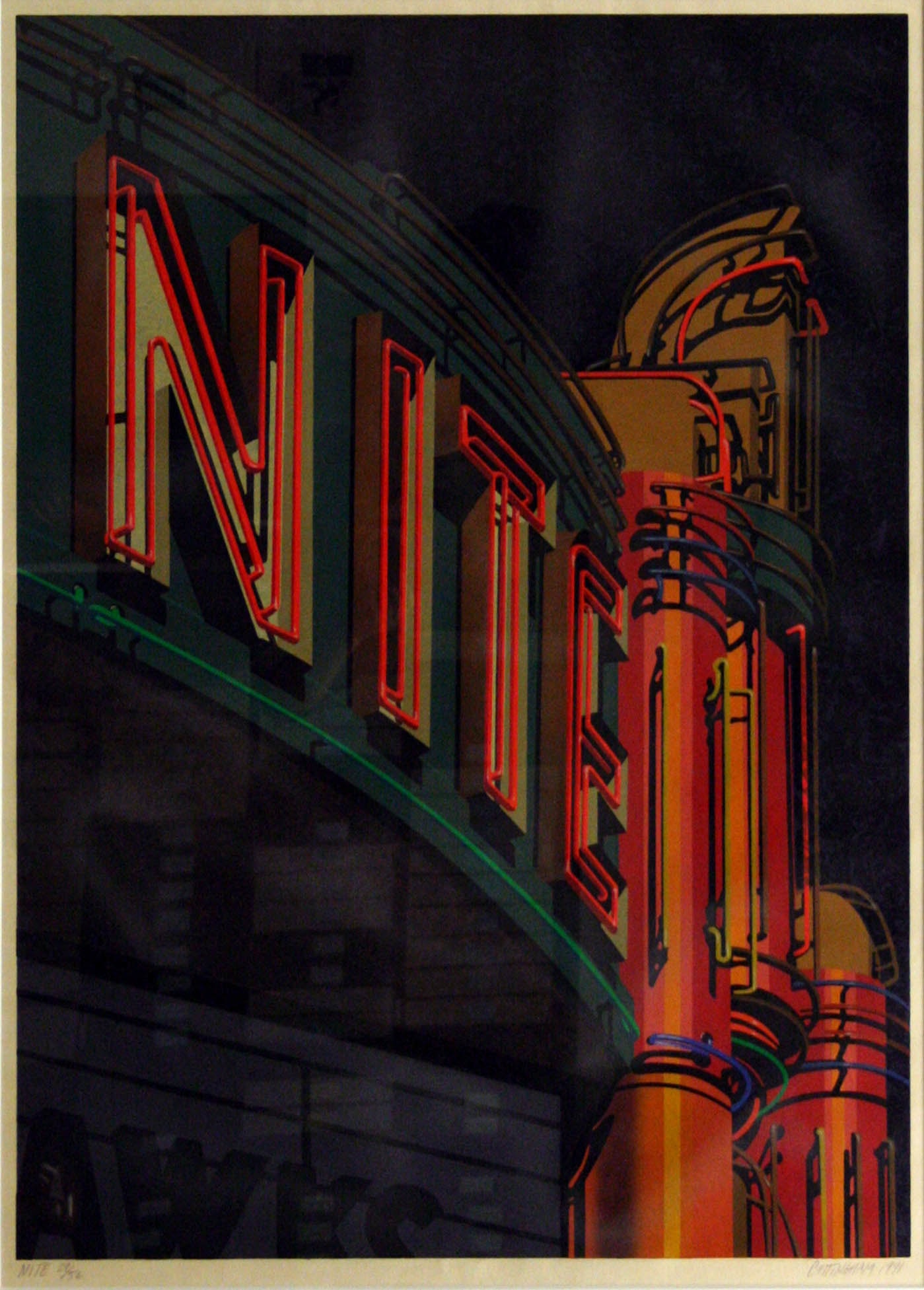 Alt Text Long Description: A print that depicts a stylized neon sign that reads "NITE" in bold, red letters outlined with glowing light tubes. The letters are mounted on a curved, green structure resembling an arched marquee. The background is a dark, muted black, emphasizing the vibrant colors of the neon sign. On the right side, there is an intricate design with overlapping circular and cylindrical shapes in shades of orange, red, and blue, giving a sense of depth and layered complexity. The composition has a dynamic, urban aesthetic, reminiscent of a bustling city nightlife. Note: the alt text was written with support from the ASU Image Accessibility Creator AI tool.