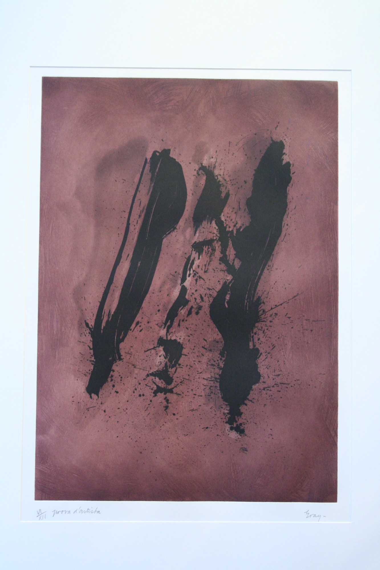 Alt Text Long Description: An abstract print with a textured background in deep reddish-brown tones. Two prominent, sweeping black brushstrokes dominate the piece, creating a bold contrast against the background. These brushstrokes appear vertical and slightly diagonal, suggestive of dynamic motion. Surrounding the main strokes, there are smaller splatters and blotches of black, adding a sense of spontaneity to the composition. The print is framed with white matting, giving it a clean, finished appearance. Note: the alt text was written with support from the ASU Image Accessibility Creator AI tool.