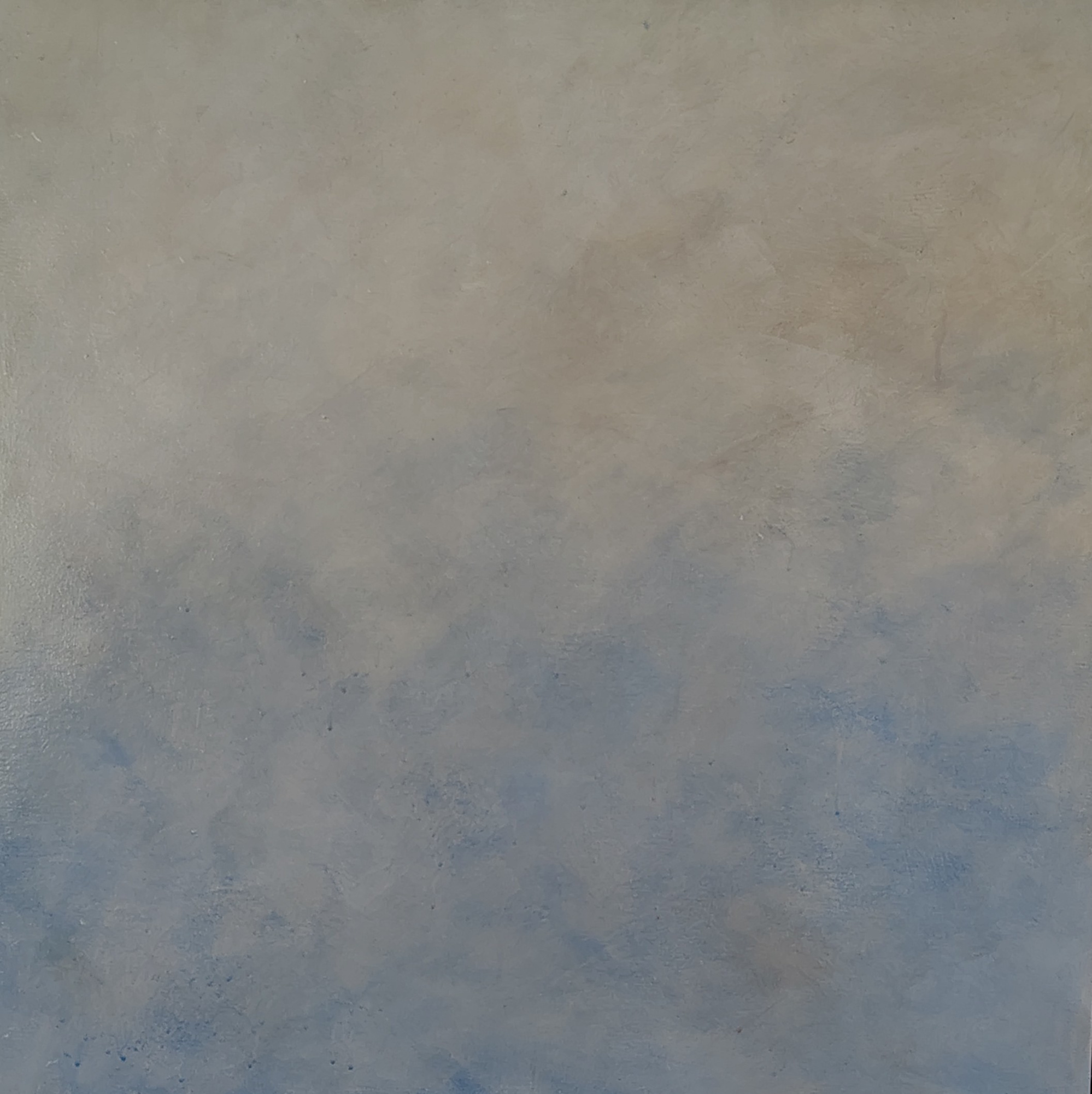 An abstract painting consisting of a blend of soft colors, primarily shades of blue, gray, and beige. The upper section transitions from light gray to beige, while the lower portion features gradations of blue, giving a sense of depth and texture. The overall surface is subtly textured with a cloudy appearance, lacking any distinct shapes or lines. Note: the alt text was written with support from the ASU Image Accessibility Creator AI tool.
