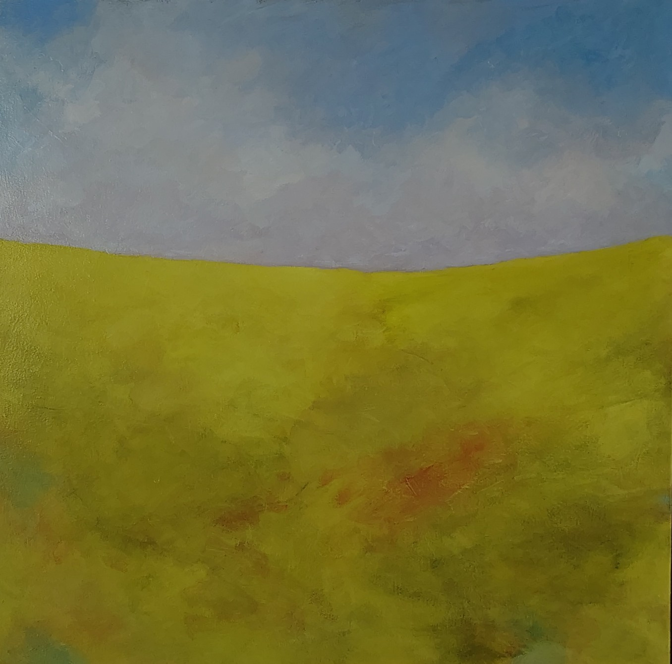 Alt text long description: An abstract landscape painting. The background features a sky filled with soft, blended tones of blue and light gray, suggesting a cloudy atmosphere. The foreground consists of a wide expanse of vibrant green, resembling a field or meadow. There are subtle variations in the green, with hints of yellow and faint patches of orange, adding texture and depth. The composition is simple and open, creating a peaceful and expansive scene. Note: the alt text was written with support from the ASU Image Accessibility Creator AI tool.