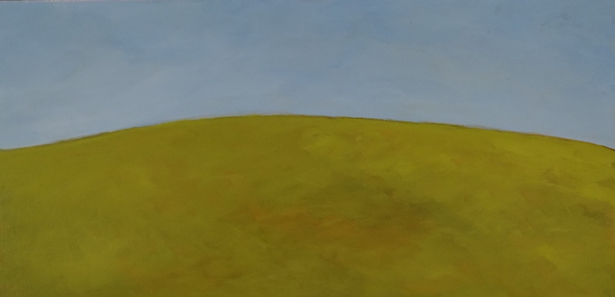 Alt text long description: A painting depicting a simple landscape featuring a grassy hill under a clear blue sky. The hill occupies the lower two-thirds of the image and is painted in blended shades of green with soft, undefined edges, creating a smooth, seamless appearance against the horizon. Above, the sky is a uniform light blue, adding a tranquil, open space feel to the composition. The overall tone is calm and minimalistic, with no other elements present in the scene. Note: the alt text was written with support from the ASU Image Accessibility Creator AI tool.