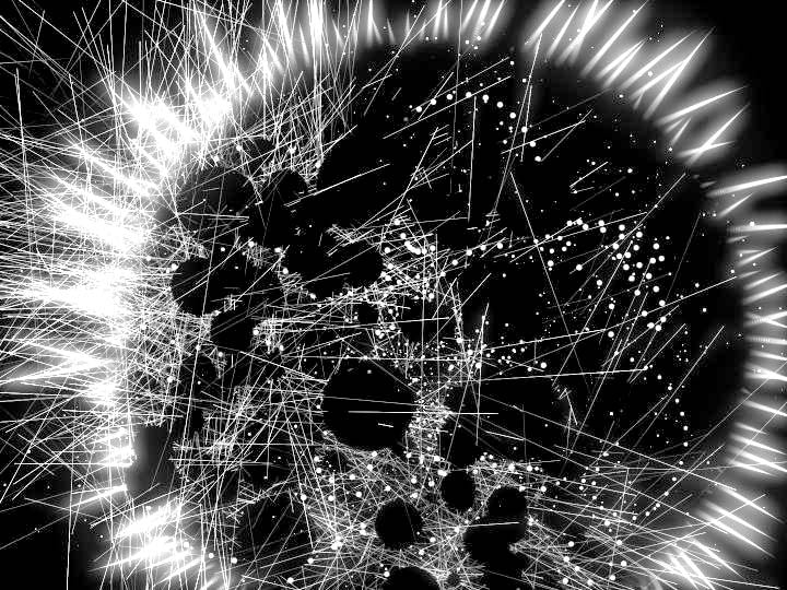 Alt Text Long Description: A high-contrast, abstract depiction featuring a chaotic array of white lines, dots, and shapes against a black background. The composition radiates from the center, with bright streaks and bursts resembling a fireworks display. The lines form crisscross patterns, while small white dots are scattered throughout, giving a sense of dynamic movement. Darker, round shapes punctuate the image, creating a stark contrast with the bright elements. The overall effect is electrifying, suggesting energy and vibrancy. Note: the alt text was written with support from the ASU Image Accessibility Creator AI tool.