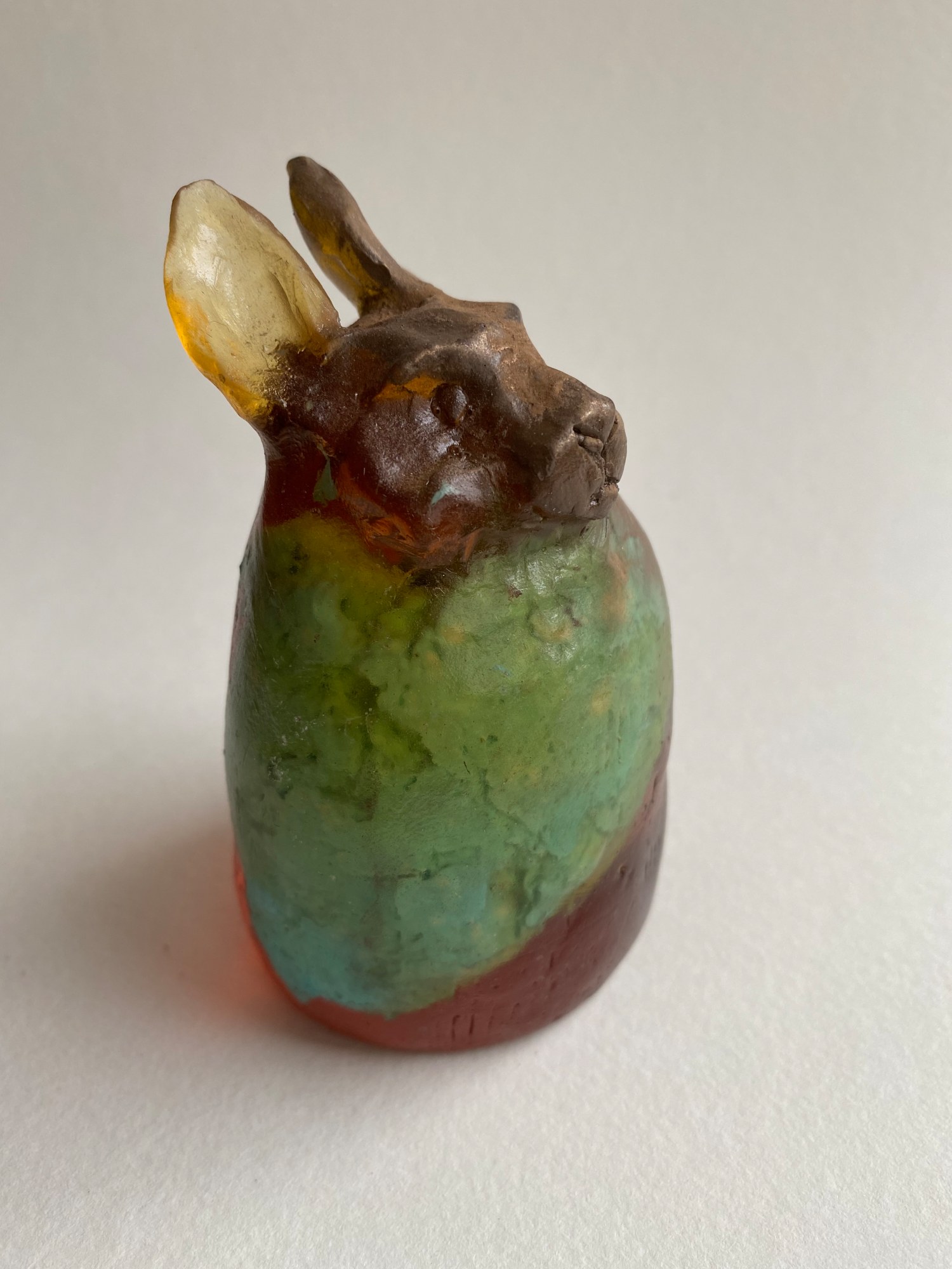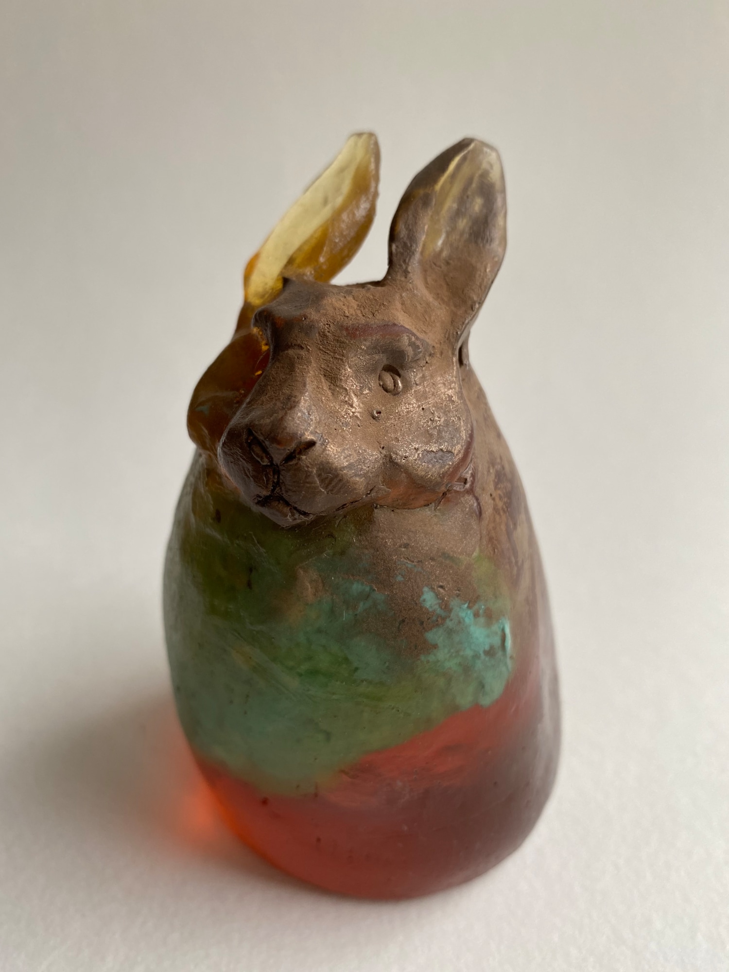 Modern Relics - I use resin to cast these little treasures so that I can encapsulate interesting elements that inspire the viewer to peer in. A plaster and paper mix creates the amorphous shape inside but I add a quartz crystal for just a little touch of alchemy, to gather the viewers’ positive emotional energy and release it back later when the sculpture finds a home. One of the parts I like the most about my little sculptures is the metal powder incorporated into the face of the creature. It’s called cold cast metal when it’s added to resin.