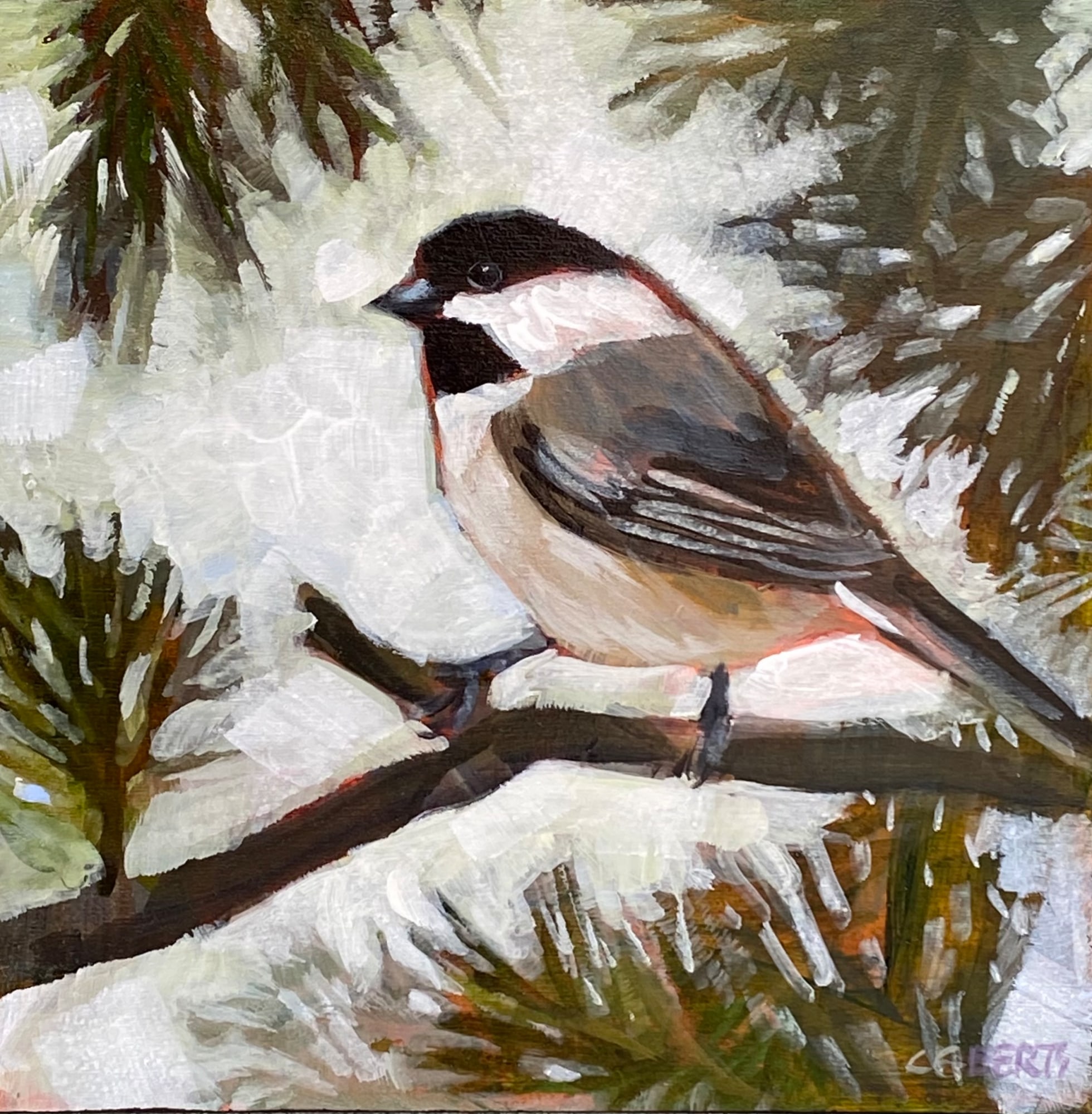 Chickadee in the Spruce - 6x6x1.5 - acrylic on board - by Connie Geerts
