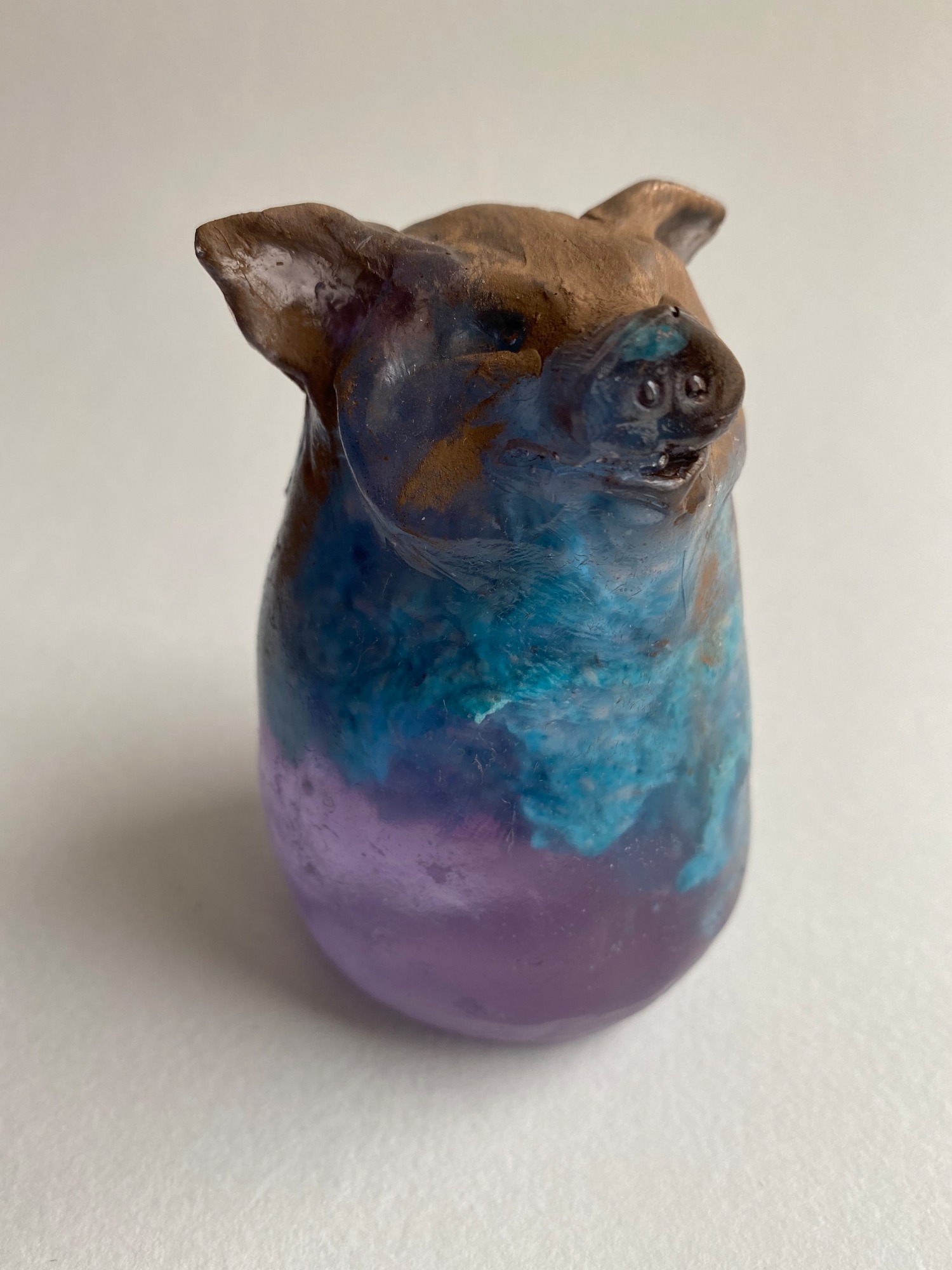 Modern Relics - I use resin to cast these little treasures so that I can encapsulate interesting elements that inspire the viewer to peer in. A plaster and paper mix creates the amorphous shape inside but I add a quartz crystal for just a little touch of alchemy, to gather the viewers’ positive emotional energy and release it back later when the sculpture finds a home. One of the parts I like the most about my little sculptures is the metal powder incorporated into the face of the creature. It’s called cold cast metal when it’s added to resin.