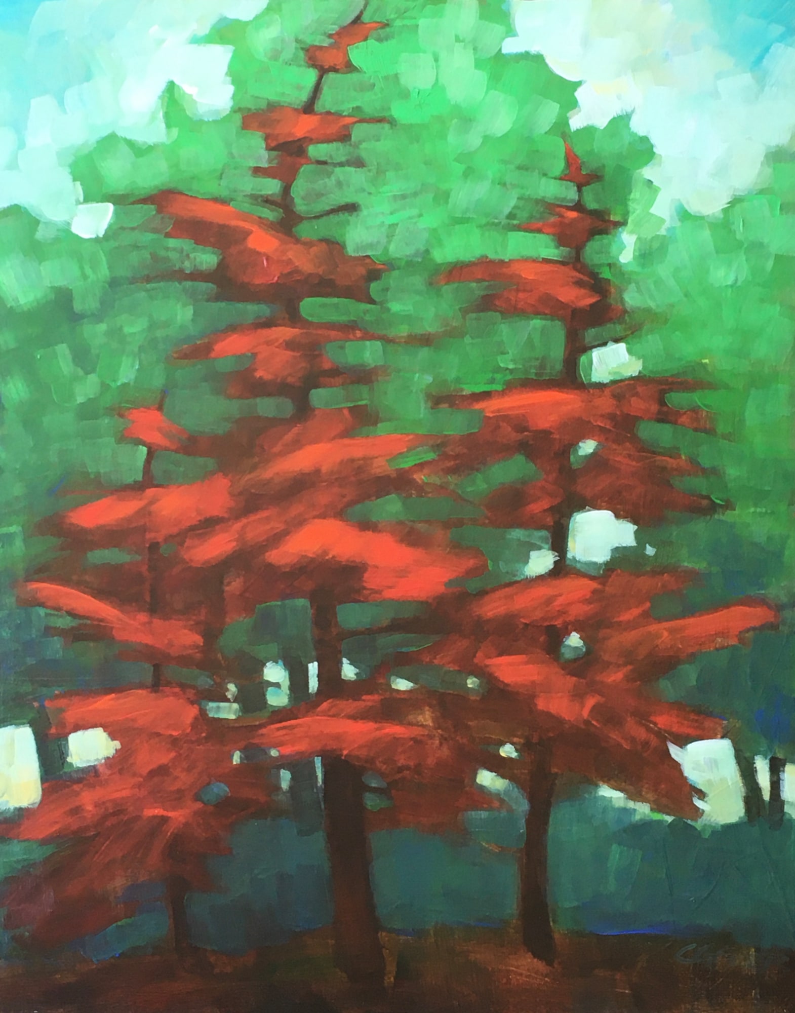 Three red spruce trees in front of a green forest, 20x16, by Connie Geerts