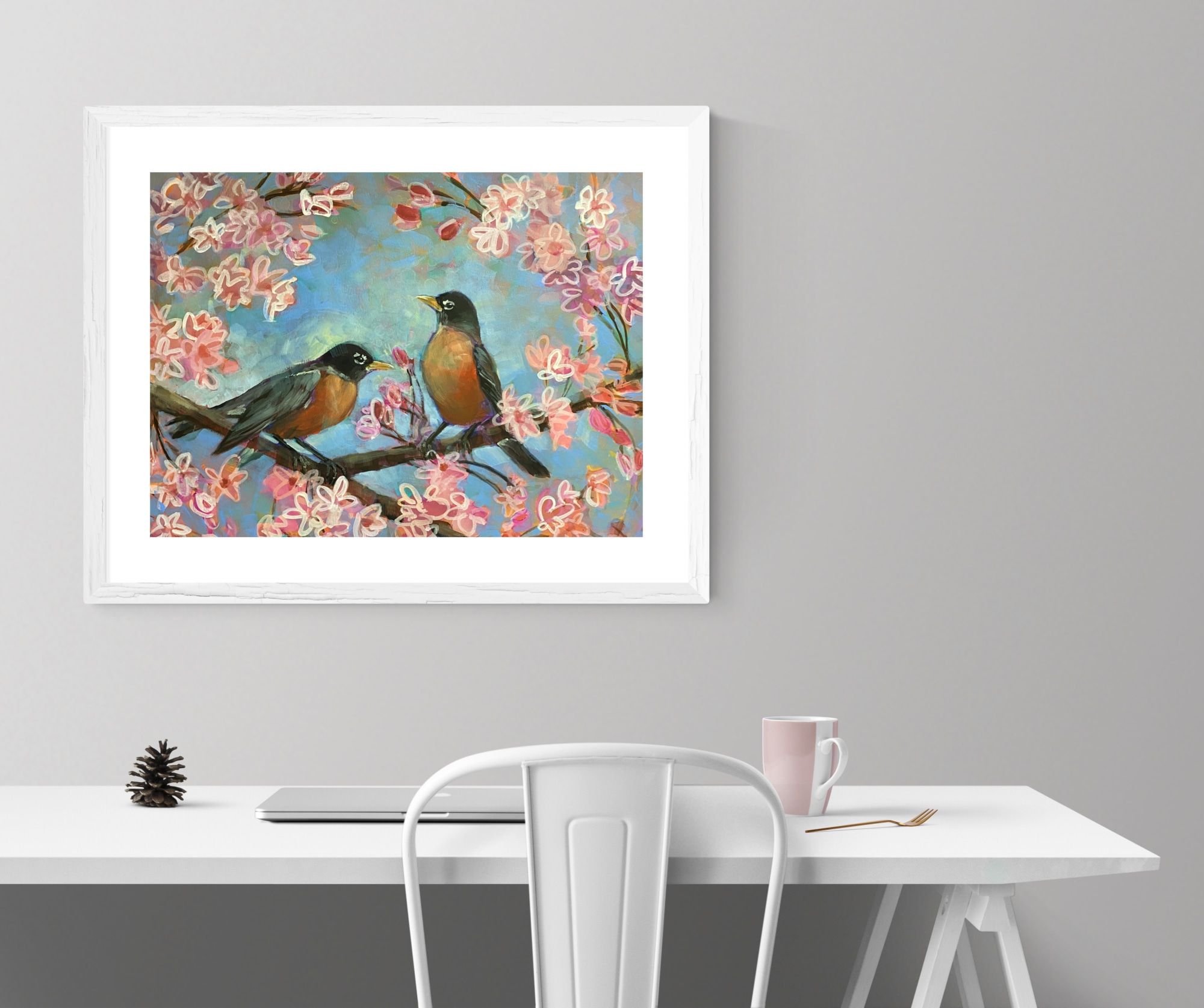17x23 Unframed - acrylic on paper - The first birds to arrive back in the Spring are the robins who build their nest in the nook of the blossoming crab apple tree in our yard. I always look forward to their return because with them comes a return of hope and expectations of growth.