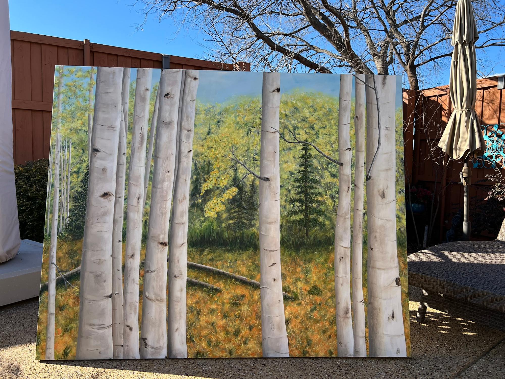 Experience the breathtaking beauty of fall with Aspen in the Fall. This stunning fine art piece captures the essence of the forest and its majestic aspen trees, transporting you to a peaceful and serene setting. Let your senses come alive as you immerse yourself in this captivating painting.