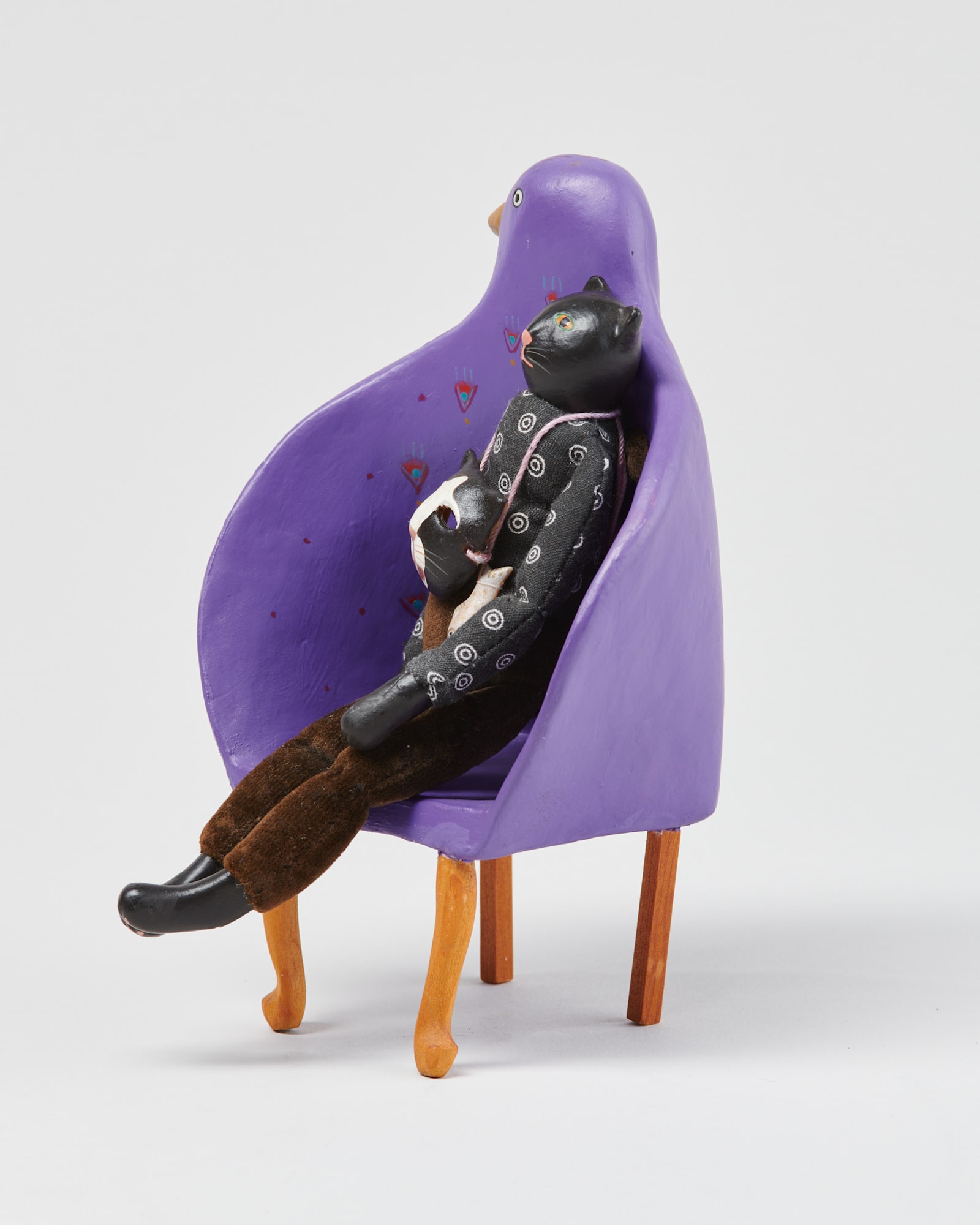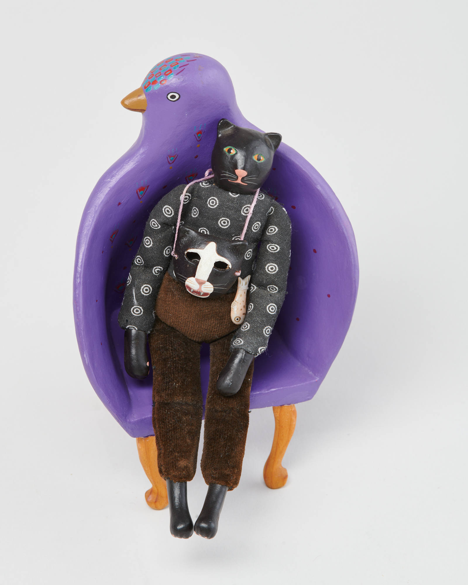 Velvet and cloth cat with ceramic or wooden feet/head. Wears a cat mask.