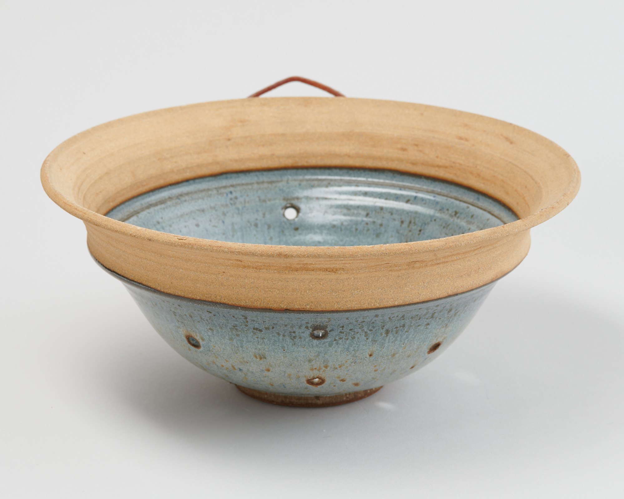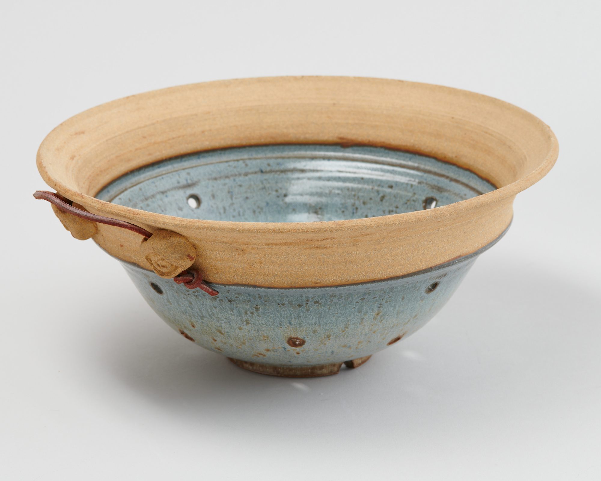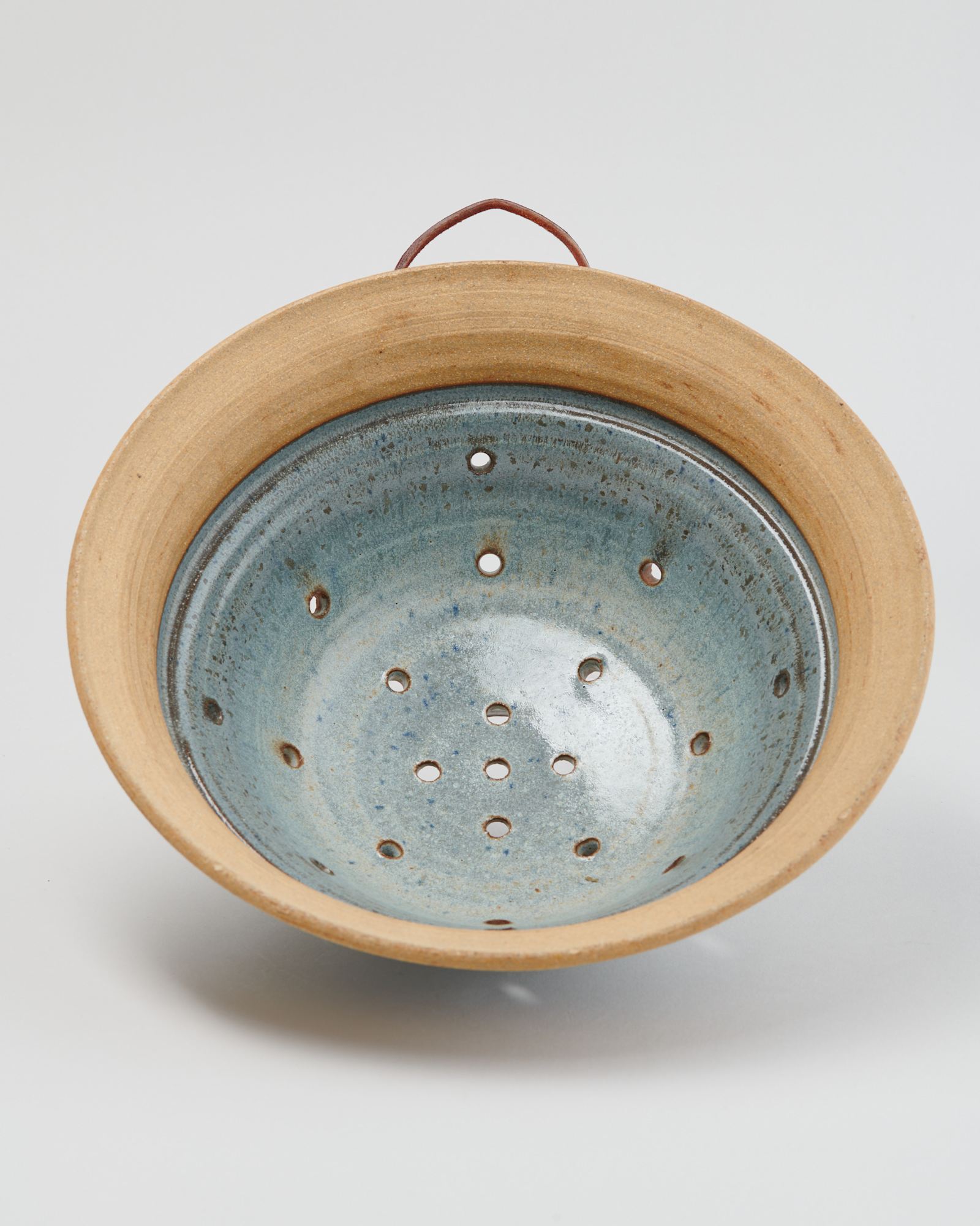 Wheel thrown, glazed. leather strap handle on one side near top. Blue/grey glaze.