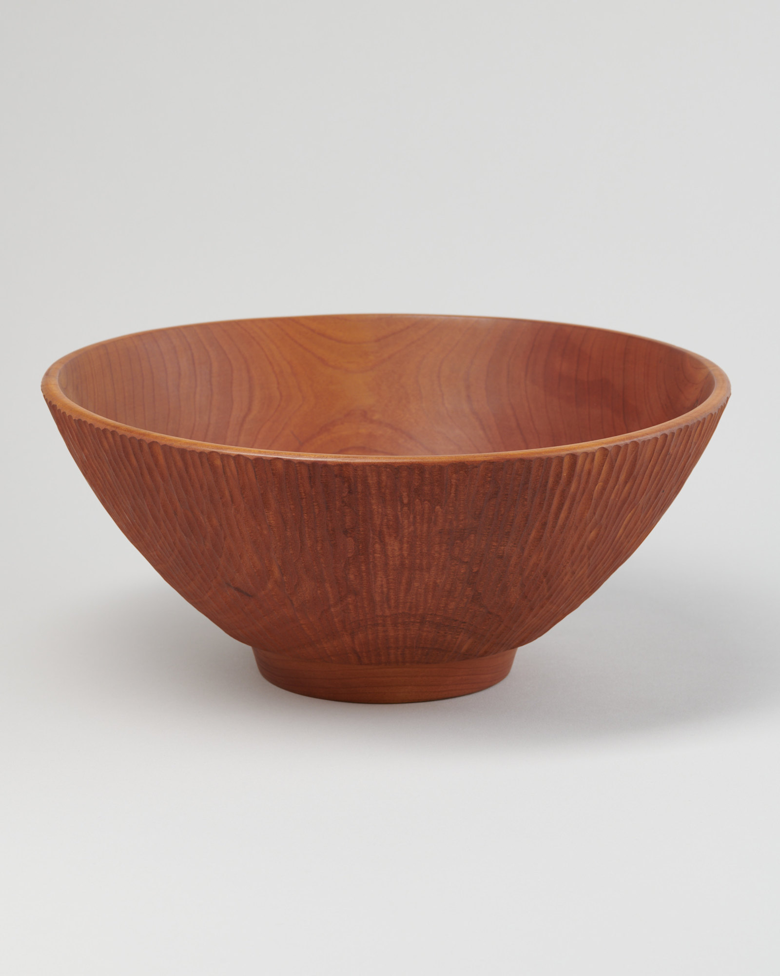 Wooden bowl with flared sides, flat rim, and constricted circular base. Interior and base have smooth finish, exterior has been finely chiseled to create a vertical fluted pattern.