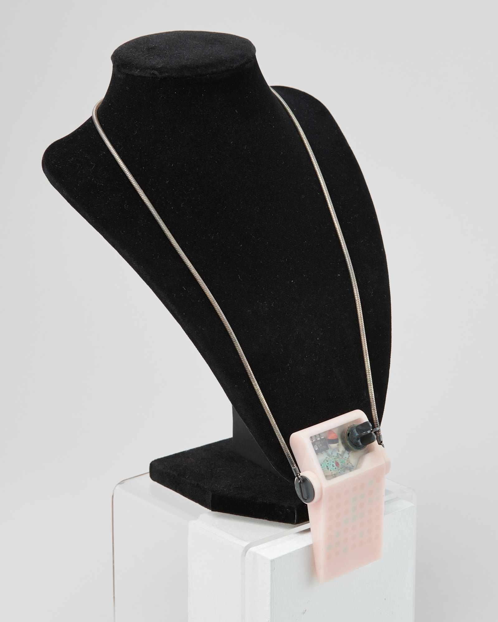 - Cast plastic resin, sterling silver chain