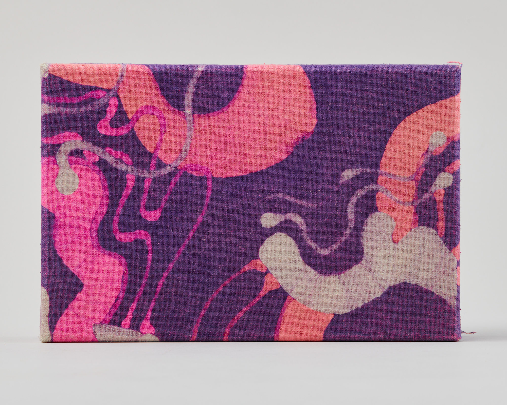 Batiked fabric on unknown wood - purple, orange, white, and pink.