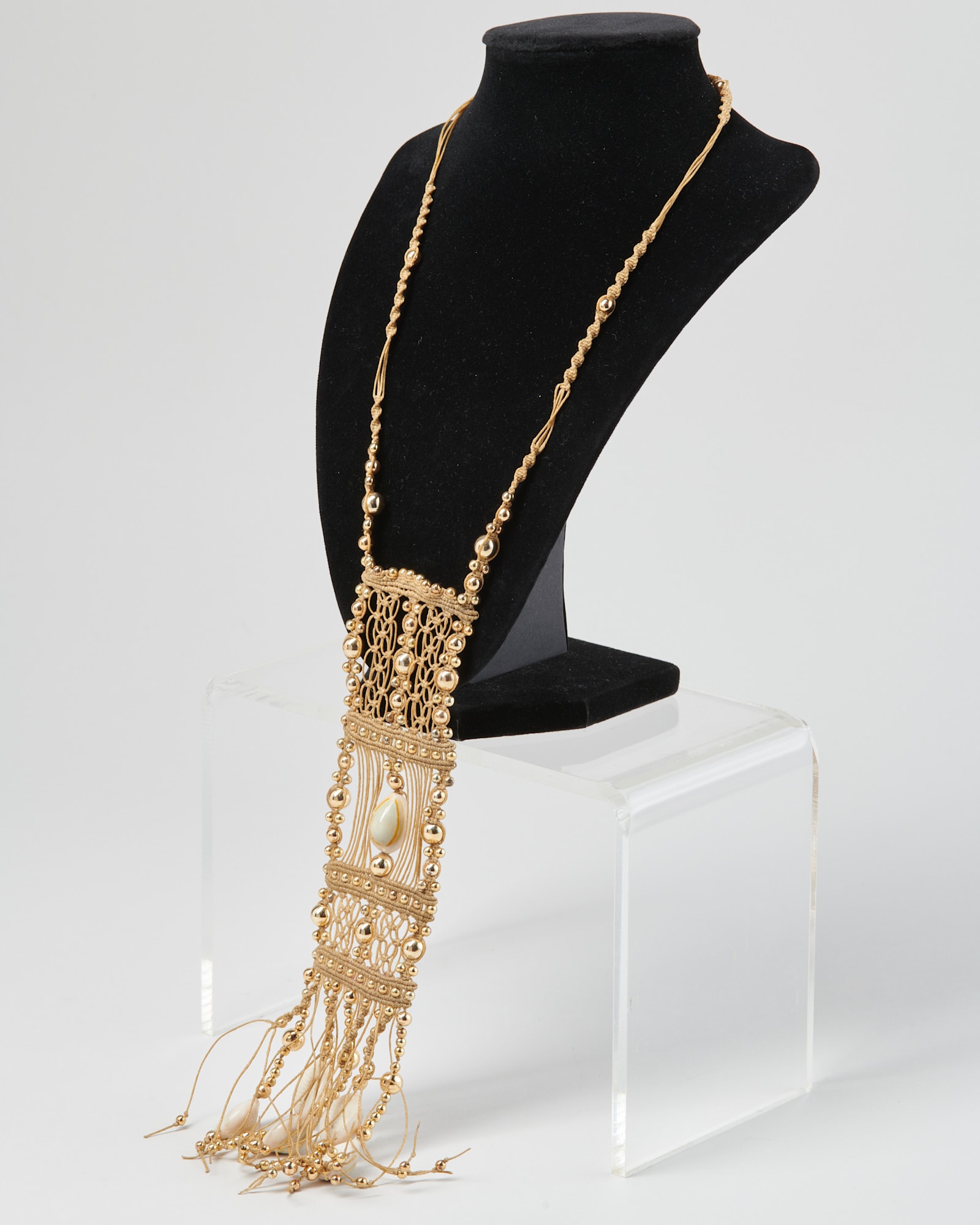 Beige macrame necklace with decorative gold beads and shells.