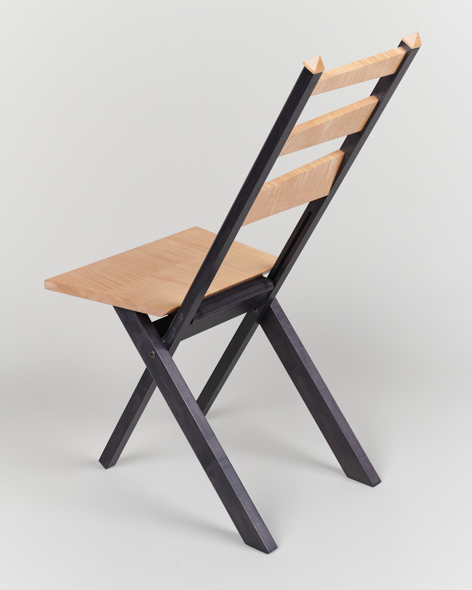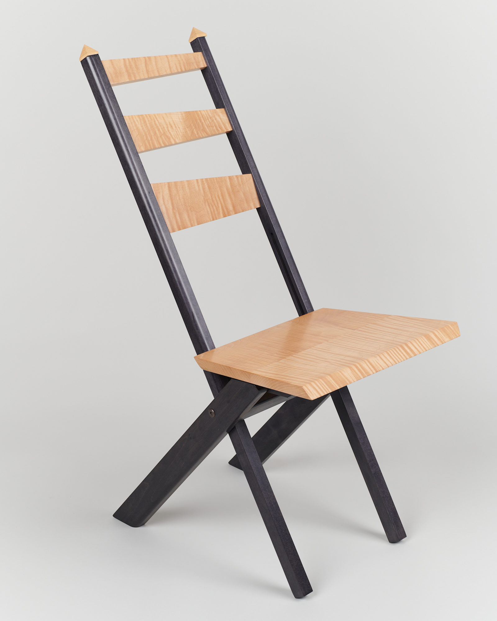 Curly maple folding chair that comes with a wooden hanging mechanism. Once the chair is refolded, the chair can be hung on the mechanism.