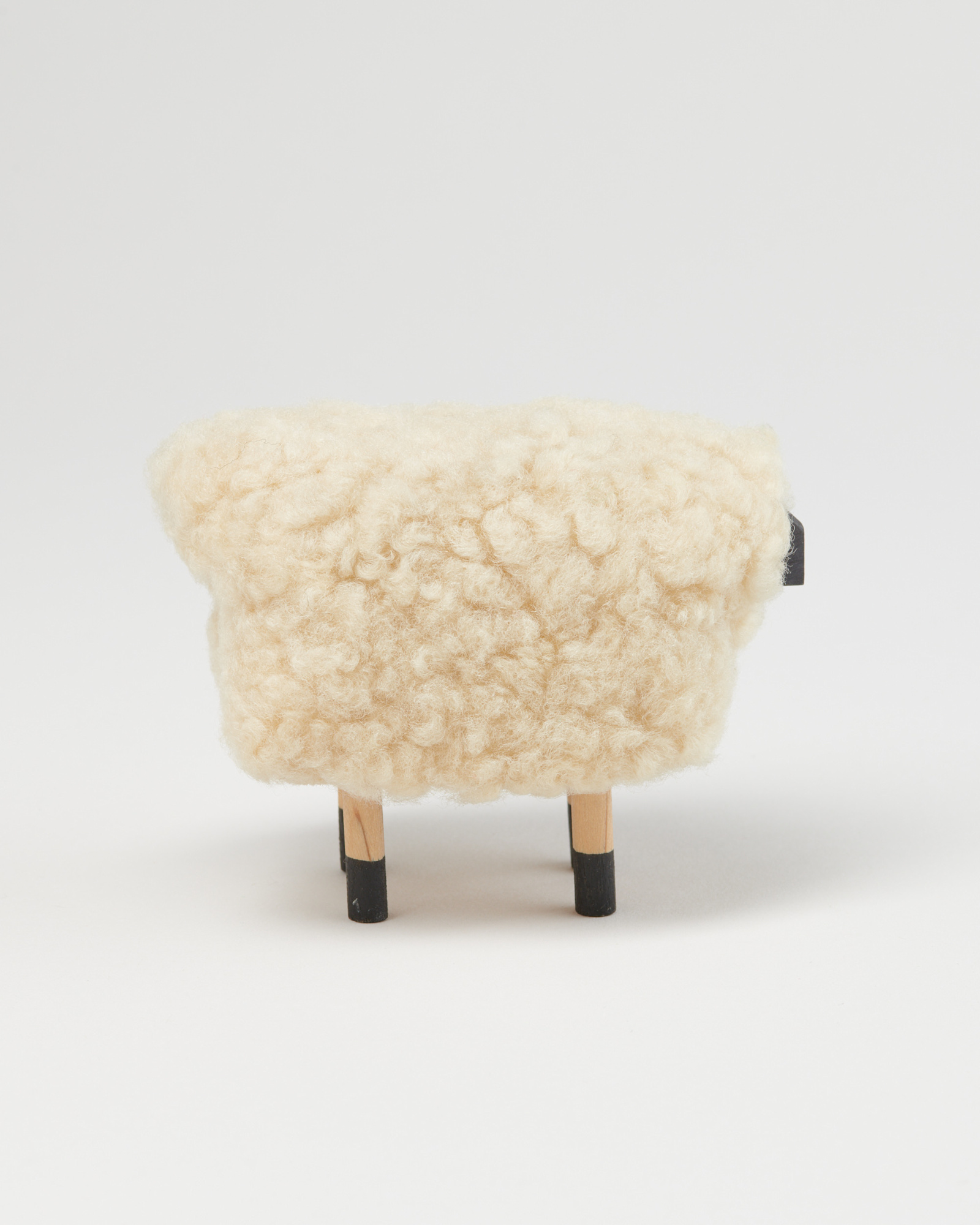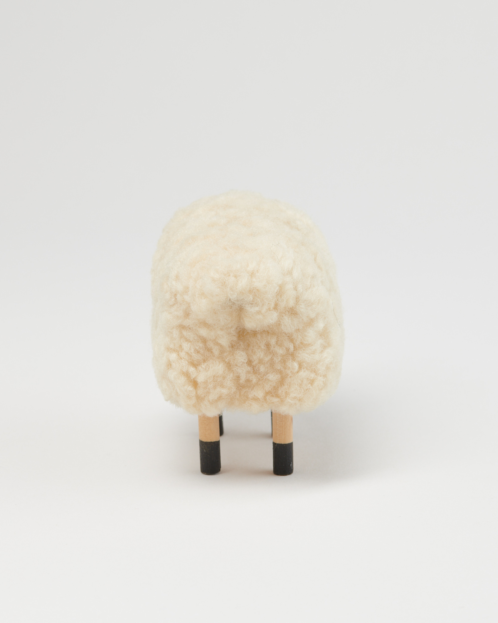 Toy sheep made of painted, glue assembled wood with sheepskin, leather, felt.