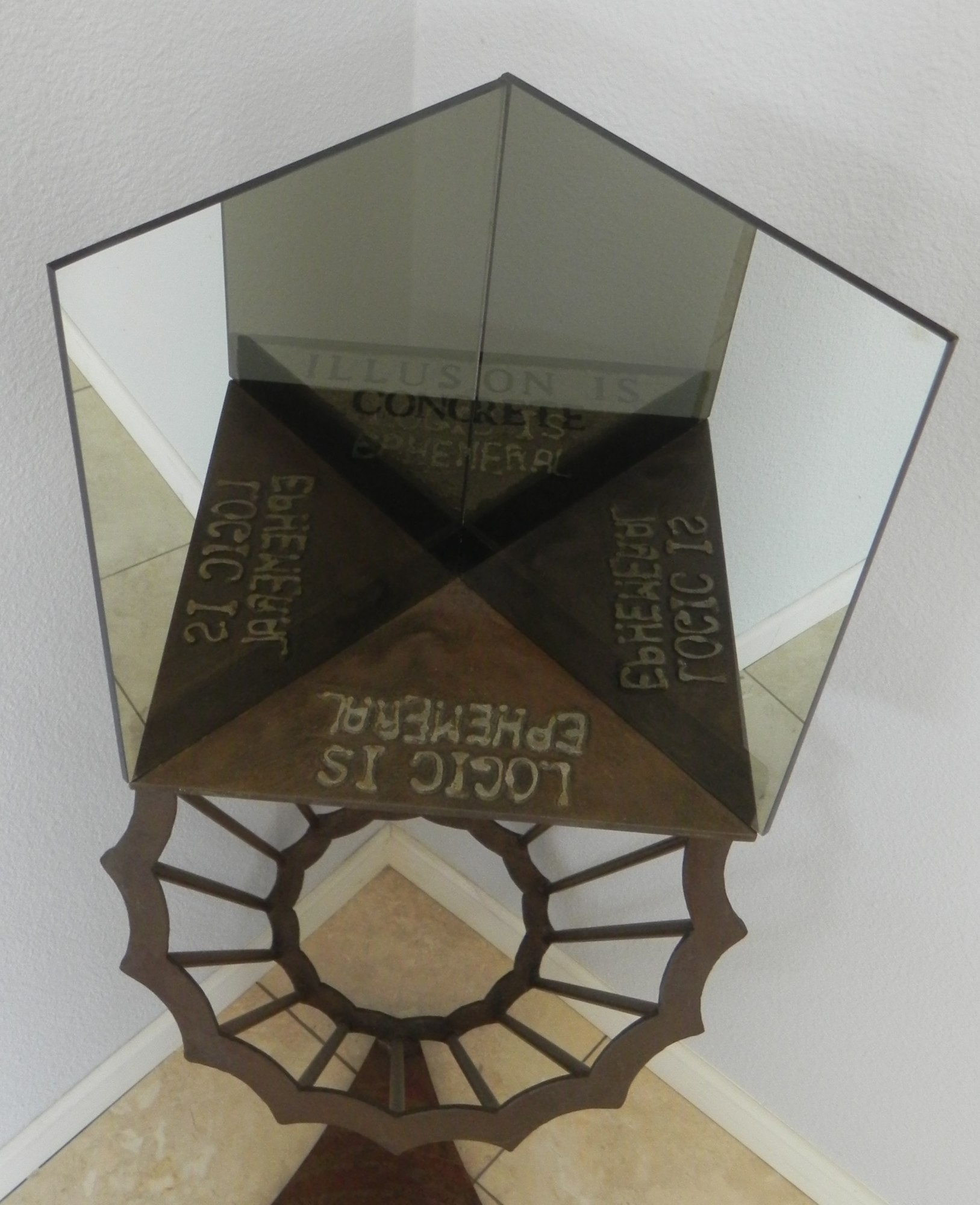"The magic of this Laudenslager piece is testing your thinking about what you see. At first look, you see two pieces of enjoined reflective glass sitting on four triangles. The front triangle has words embossed "Logic is Ephemeral”. The back triangle is filled with concrete, with words “Illusion is Concrete”.