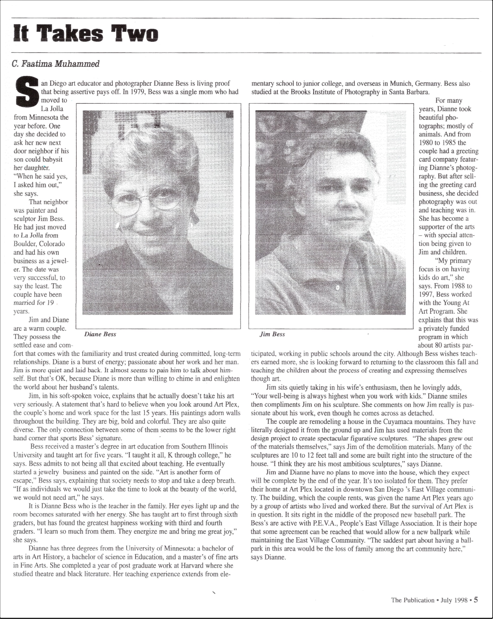 Excerpt from Scot Mc Dougall on working with a "Santa Fe artist, Frank Howell. He needed some help with his gallery in #La_Jolla and asked if I would help out for 6 months or so. At the time he was showing a San Diego artist, by the name of Jim Bess. Jim and his photographer wife, Dianne were visiting Santa Fe to see the gallery. We hit it off from the start. They graciously offered to let me stay in their home while I was in town. That was 26 years ago and I am still living in San Diego. My early years in San Diego were spent in the East Village on 9th and K, currently known as the First base line at Petco Park. The building was the Artplex and was the brain child of Jim and Dianne Bess as they expanded their greeting card business to that address. Ultimately deciding on giving up the greeting card business and instead decided to make it their home. With 14,000 square feet, that’s a lot of home. So, they took the top floor and turned into a private residence, with a working elevator, and Jim’s painting studio. The rest of the building would house a variety of artistic endeavors. Jim even converted the basement into a printing studio later on." - Courtesy EAST VILLAGE PROJECT 2014
