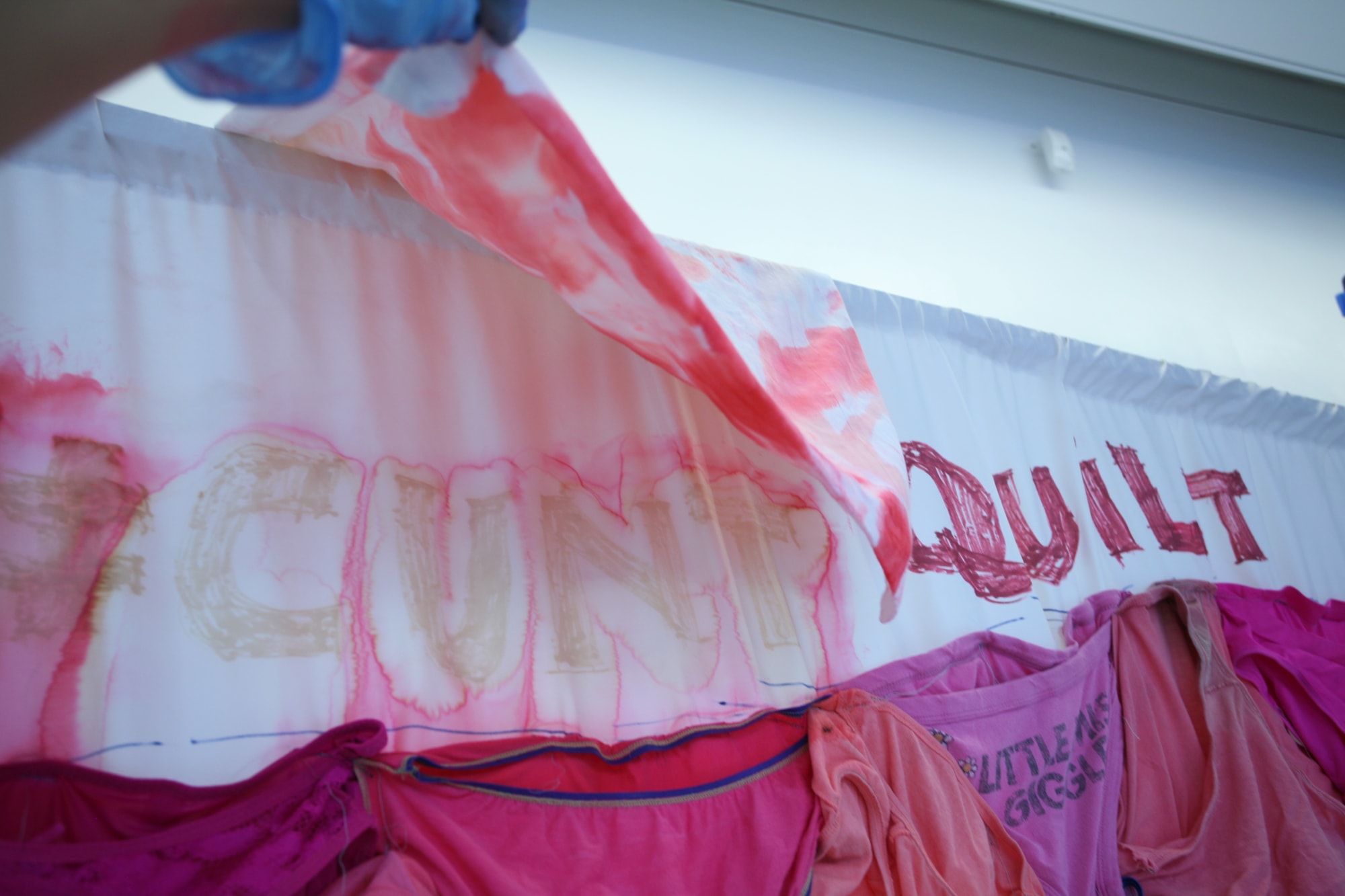 The Old Glory Underwear Audit lead to an Inaugural Stitch n Bitch at the City of Today for Feminine Urbanism studio in Greenpoint, Brooklyn. A gathering of ladies from different intersectional feminist backgrounds began pinning discarded drawers onto a used bedsheet the evening of January 18, 2017. Late Friday night I finished stitching the sullied skivvies and shoved the Inaugural Cunt Quilt into a carry-on suitcase, headed for the nation’s capital to protest the inauguration of president #45. The Cunt Quilt is the official flag for the City of Today for Feminine Urbanism and will be flown at the inaugural Women’s March in January 2017. The Cunt Quilt project, consisting of the Old Glory Underwear Audit, Stitch n Bitch and Cunt Congress will continue quarterly until there is a woman in the WhiteHouse.