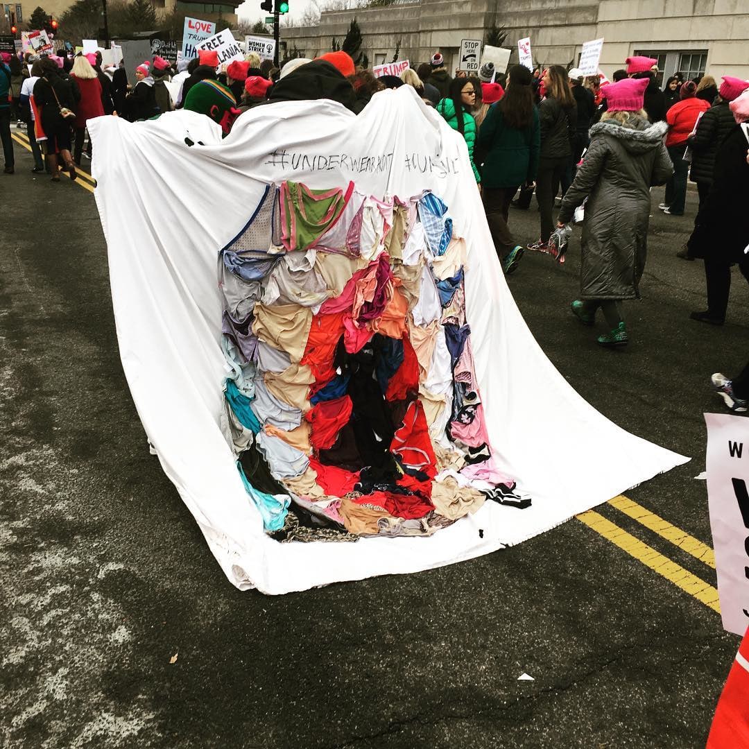 Arpillera Americanx * Cunt Quilt (Inaugural) was carried by 4 feminists during a Performance of Citizenship at the Women’s March on Washington (Cunt Congress) to protest the US presidential inauguration on January 21, 2017. Bearing the arpillera on their backs for 8 hours without food, water or bathroom, the protesters were joined by over a million feminists marching along Independence Avenue across the Washington Mall. Over 100 pairs of worn out women’s underwear dangled from the stained Queen size bedsheets as onlookers in pretty pink "Pussy hats" laughed, cried or were disgusted by the abject underwear composed in a halo pattern around a carnal interpretation of Betsy Ross' problematic American History.