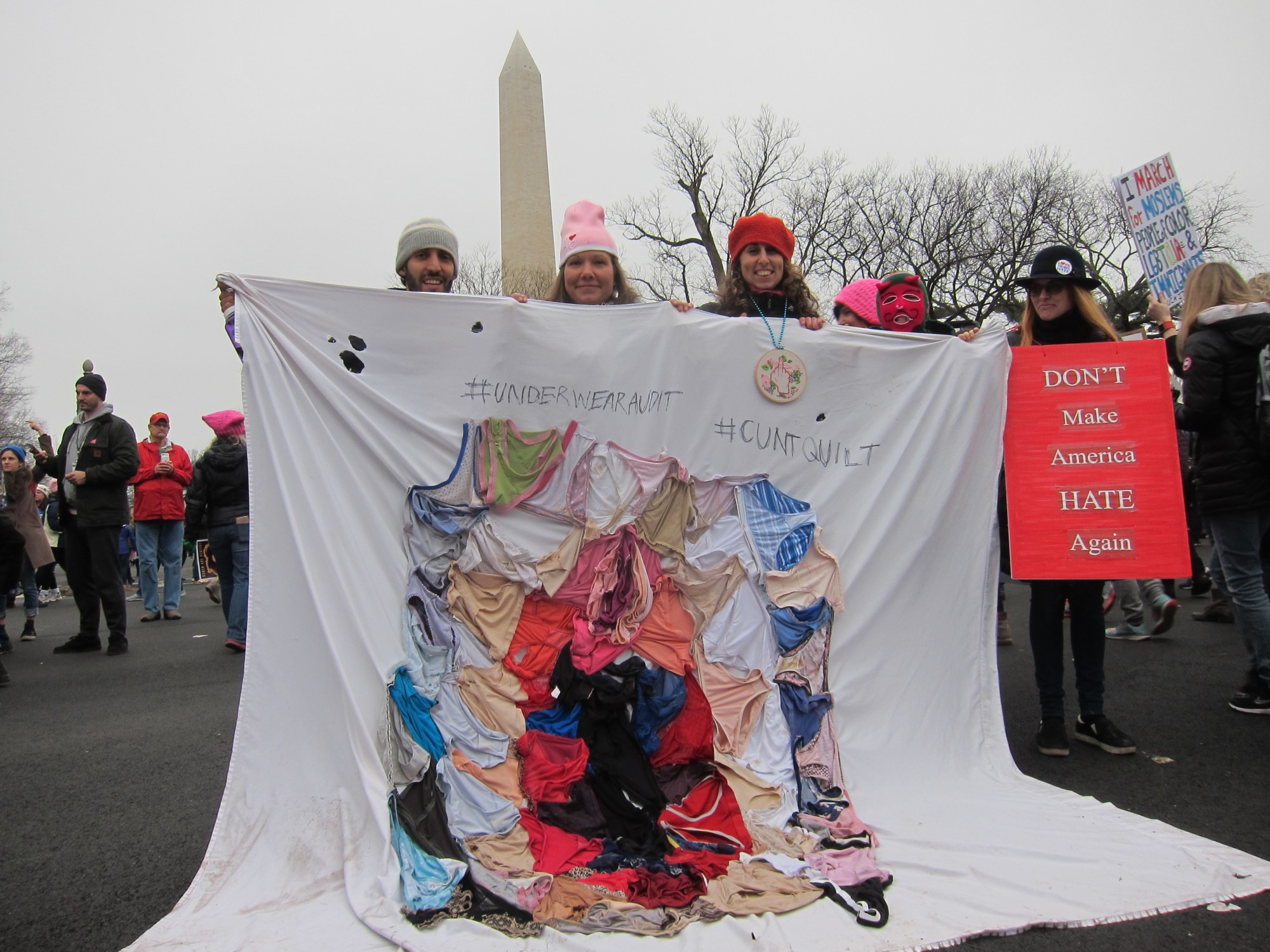 Groups of nearby women shouted “Hands Off Our Cuntry” and “We want a leader, not a dirty Tweeter!”, as the Cunt Quilt Arpillera group shouted “Mujeres, Unidas, Jamas Seran Vencidas!”. After performances by musicians, comedians and civic leaders were beheld, the protesters issued the National Underwear Audit Call: “Give us your tired, your poor, your huddled drawers, yearning to breathe free! The Underwear Audit, Stitch n Bitch, Cunt Quilt and Cunt Congresses will continue until there is a Woman in the Whitehouse!"