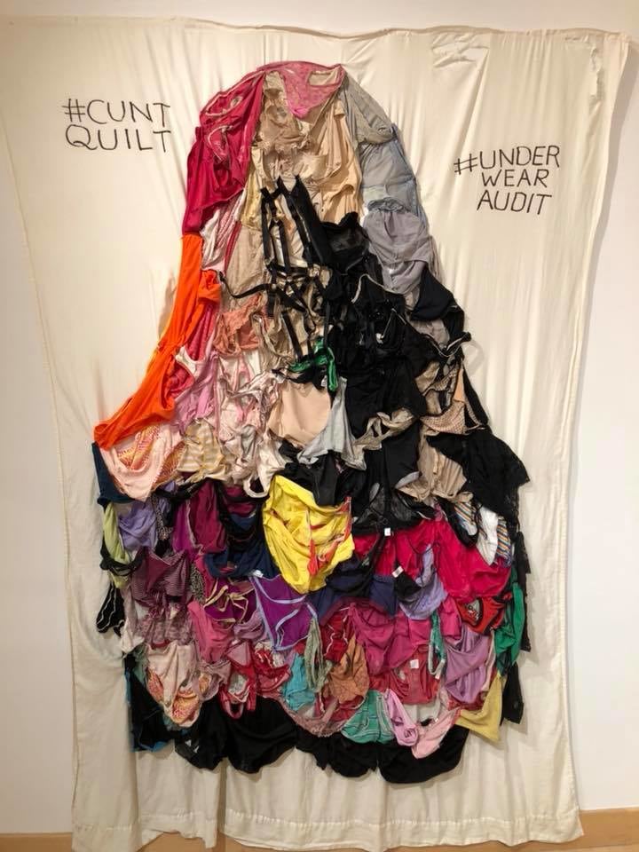 collecting worn-out women’s underwear to sew into arpilleras called Cunt Quilts at quarterly Stitch n Bitch
