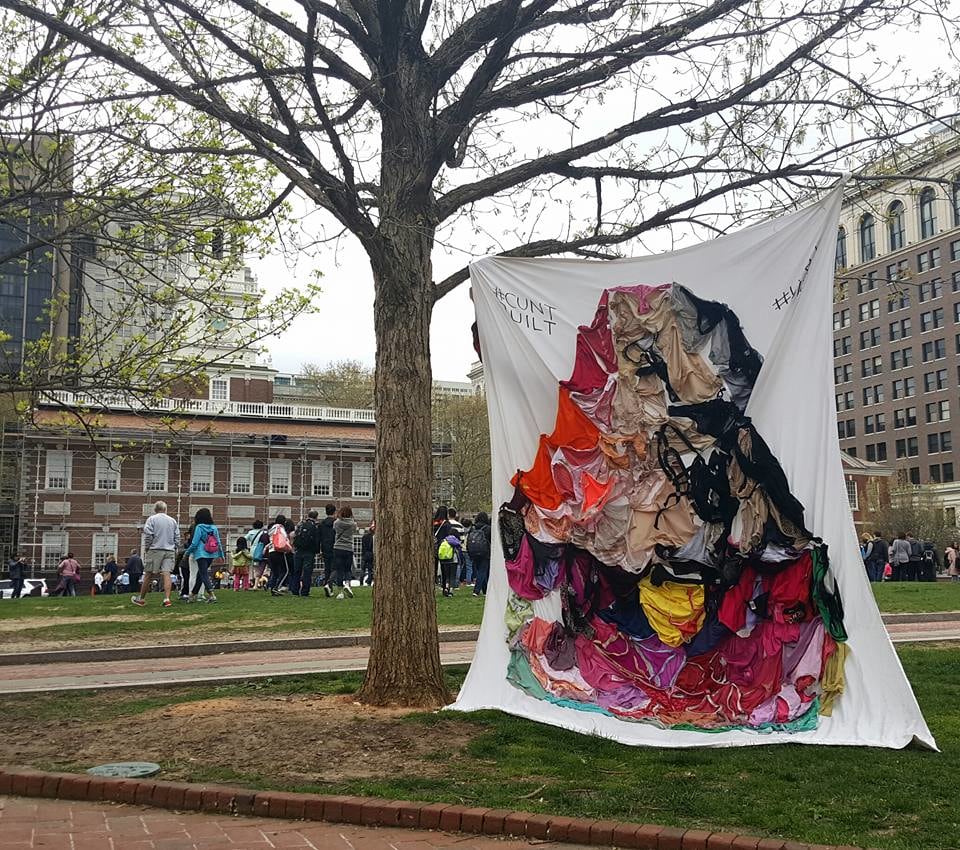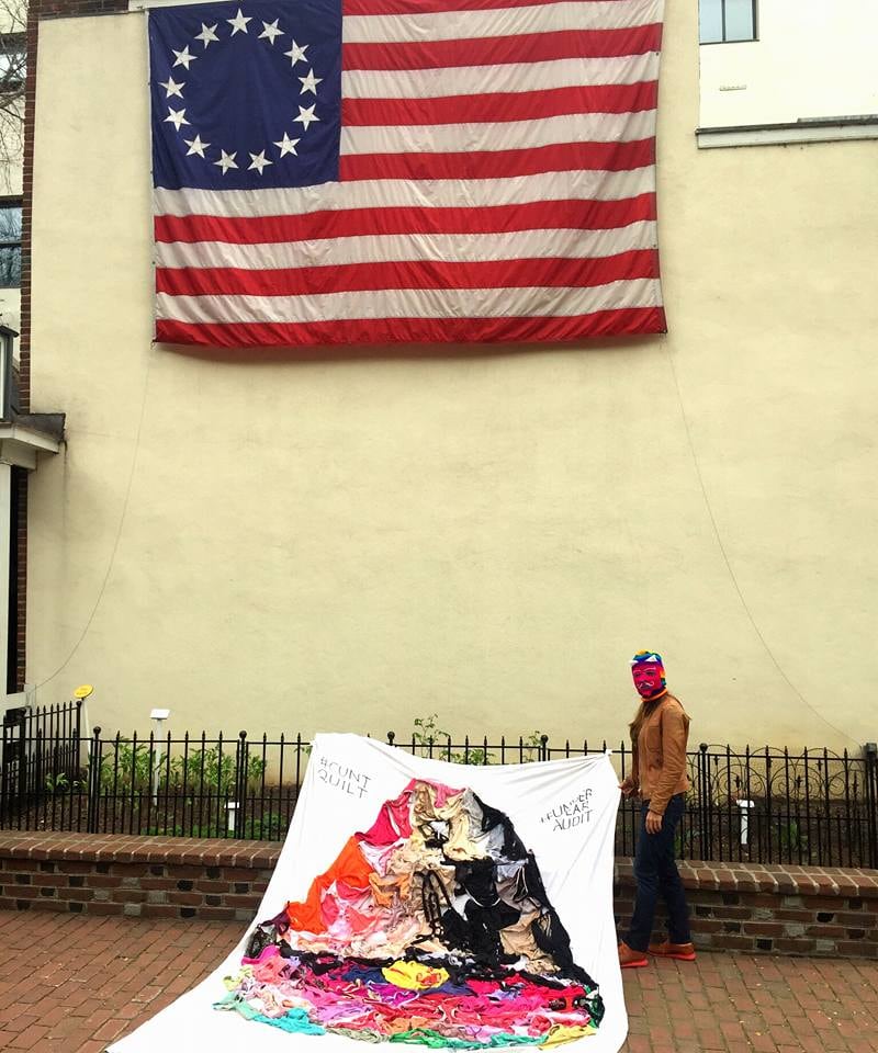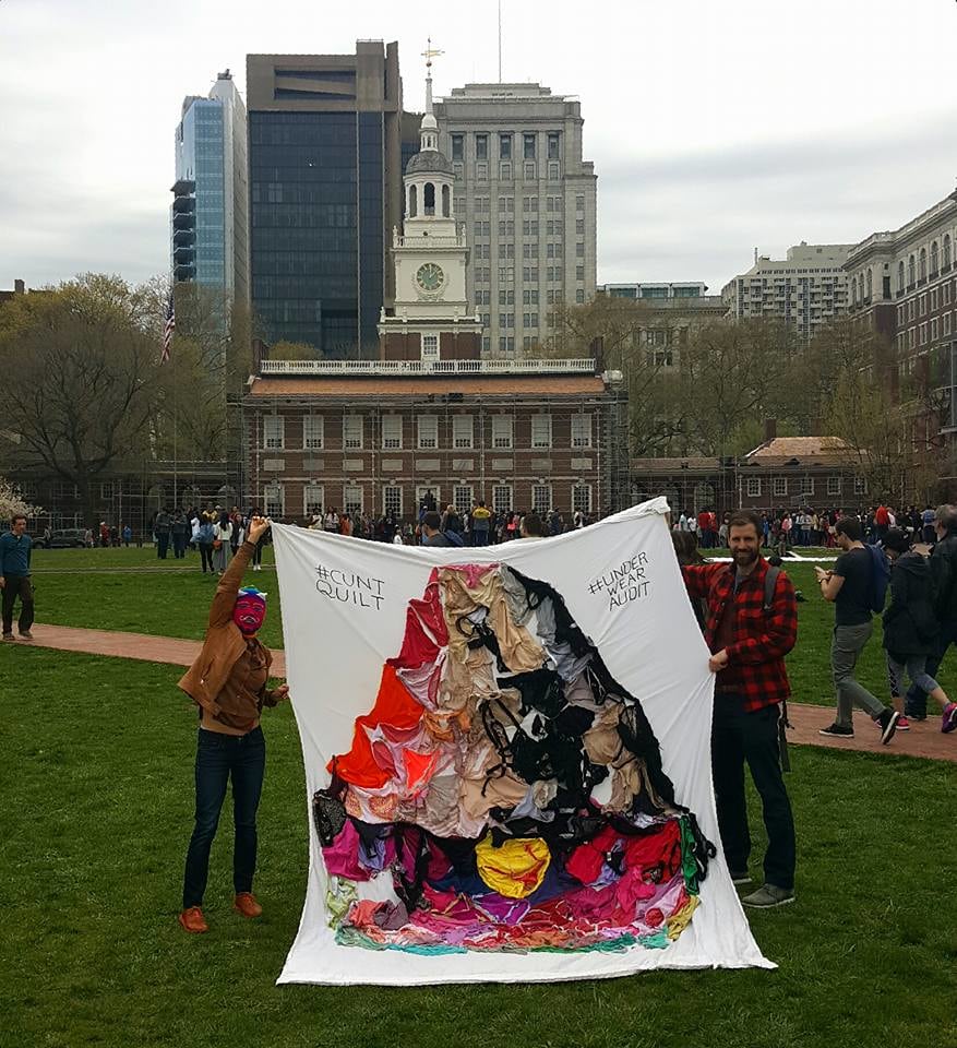 The Old Glory Underwear Audit lead to an Inaugural Stitch n Bitch at the City of Today for Feminine Urbanism studio in Greenpoint, Brooklyn. A gathering of ladies from different intersectional feminist backgrounds began pinning discarded drawers onto a used bedsheet the evening of January 18, 2017. Late Friday night I finished stitching the sullied skivvies and shoved the Inaugural Cunt Quilt into a carry-on suitcase, headed for the nation’s capital to protest the inauguration of president #45. The Cunt Quilt is the official flag for the City of Today for Feminine Urbanism and will be flown at the inaugural Women’s March in January 2017. The Cunt Quilt project, consisting of the Old Glory Underwear Audit, Stitch n Bitch and Cunt Congress will continue quarterly until there is a woman in the WhiteHouse.