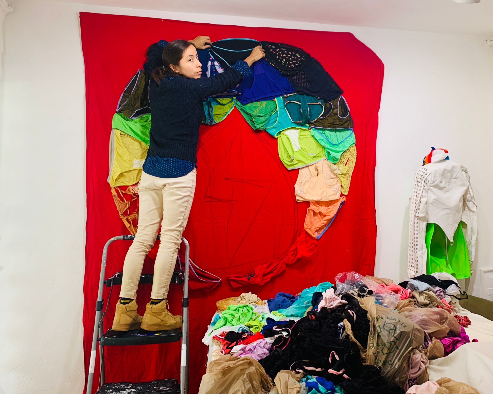 Anticipating the 2020 US election, after the US withdrew from Unesco in 2017 participants examine environmental pulses including forest fires, increased storm frequencies, and energy independence struggles; climate justice is central to the survival of our intersectional community. Arpilleristas democratically created a crowd sourced image to address questions on Climate Crisis & Denial, Environmental Justice and Energy Independence with Latinx leaders, environmental advocates and feminists online nationwide. Based on the image generated from the discussion during quarantine, artist Coralina Rodriguez Meyer sewed worn out women's underwear donated through the US postal service via a National Underwear audit onto a Qeen sized bedsheet. The arpillera became a Sanctuary City protest flag for the climate justice movement.