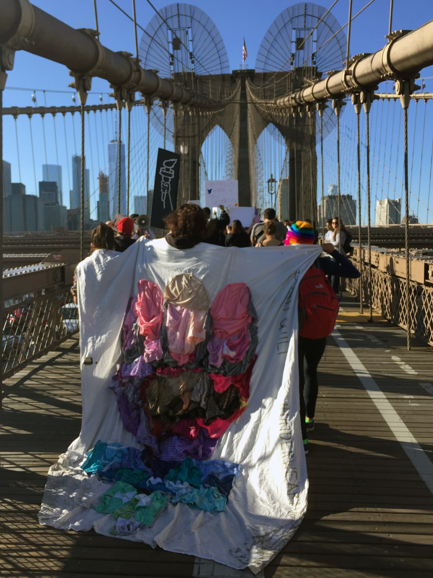 During a Performance of Citizenship, Arpillera Americanx * Cunt Quilt (Power) was born on protester's backs during the March for Racial Justice Cunt Congress across the Brooklyn Bridge to NYC City Hall in downtown Manhattan on October 1, 2017. Kneeling (ala Colin Kaepernick solidarity) in front of NYC City Hall to honor victims of police brutality, protesters donned the Sanctuary City protest flag celebrating the 50th anniversary of the exonerated Black Panther party members who were wrongfully charged after the bombing of a Bronx police station.