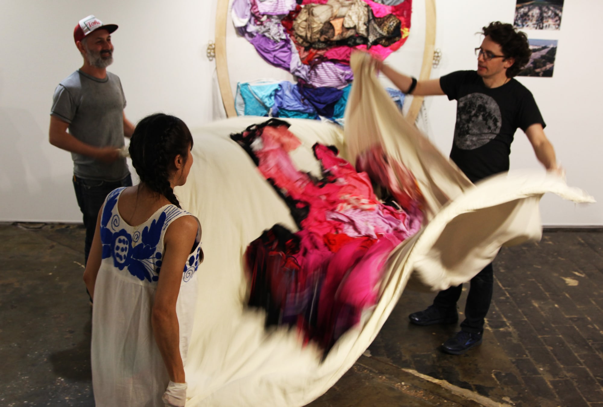 The Old Glory Underwear Audit lead to an Inaugural Stitch n Bitch at the City of Today for Feminine Urbanism studio in Greenpoint, Brooklyn. A gathering of ladies from different intersectional feminist backgrounds began pinning discarded drawers onto a used bedsheet the evening of January 18, 2017. Late Friday night I finished stitching the sullied skivvies and shoved the Inaugural Cunt Quilt into a carry-on suitcase, headed for the nation’s capital to protest the inauguration of president #45. The Cunt Quilt is the official flag for the City of Today for Feminine Urbanism and will be flown at the inaugural Women’s March in January 2017. The Cunt Quilt project, consisting of the Old Glory Underwear Audit, Stitch n Bitch and Cunt Congress will continue quarterly until there is a woman in the WhiteHouse.