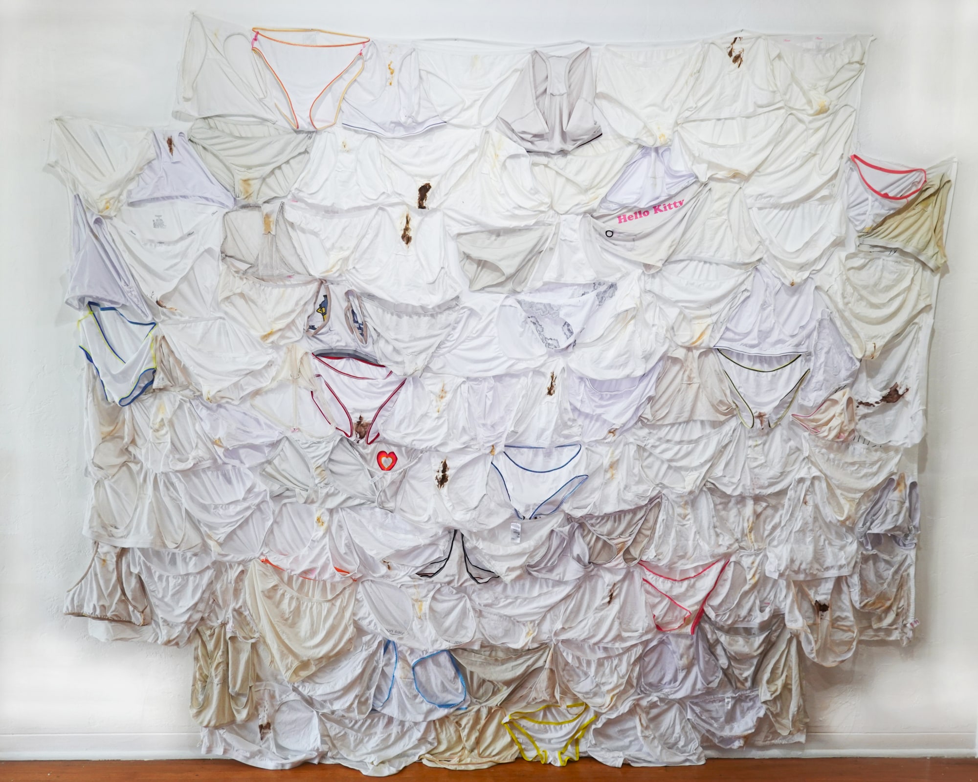 • worn out women's underwear sewn on stained, Queen sized bedsheet