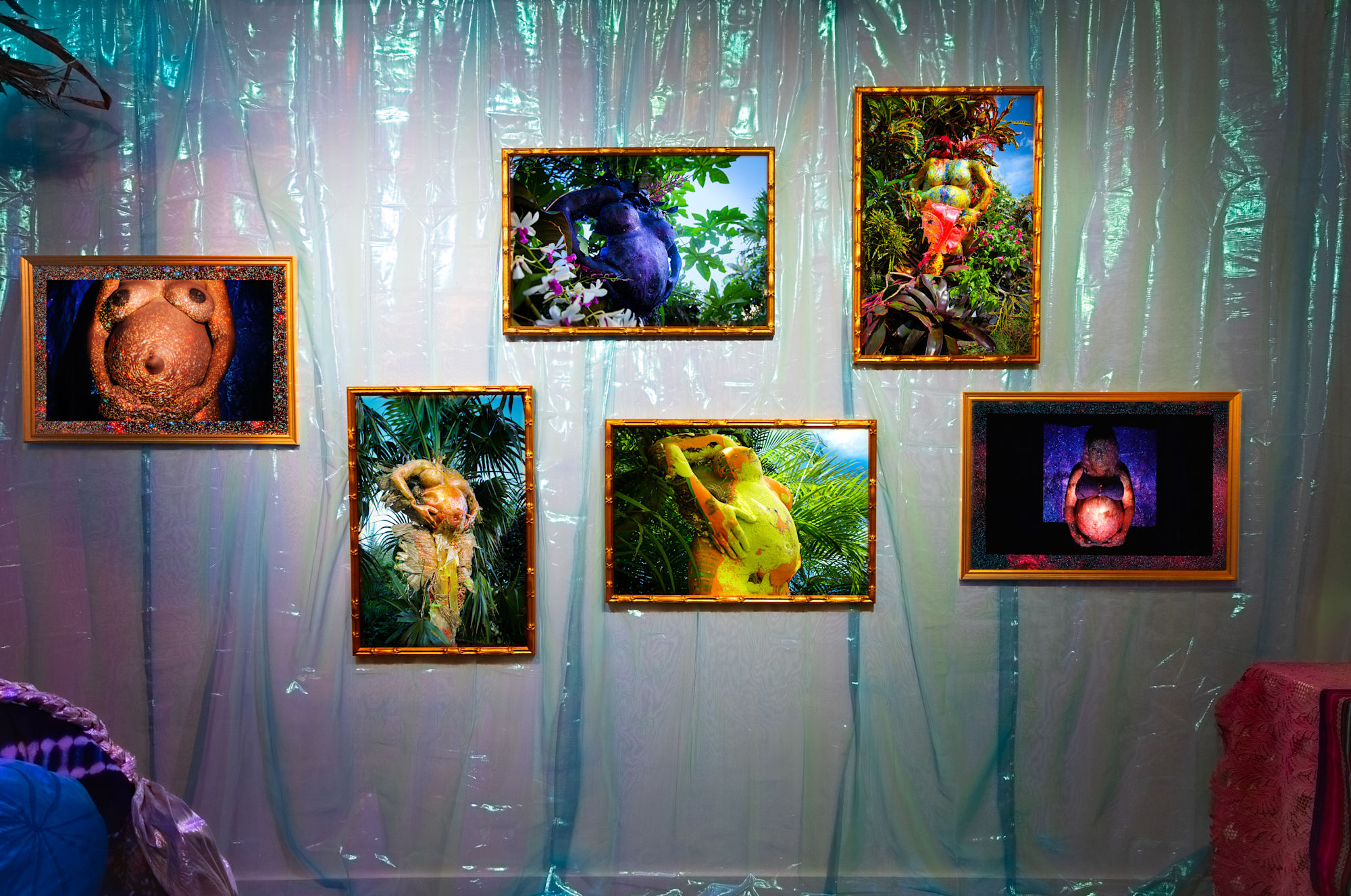 Apariciones: Virgen Gruta (2020-present) photographs render fertility effigy altars of Mother Mold monuments in their fecund habitat to reclaim American material refuse as a vernacular, maternal refuge. Venerating entropic life and death cycle rituals across indigenous equatorial cultivars, the vibrant retablos are apparitions of vulnerable, yet unvanquished interior psychic landscapes overcoming assimilation and species collapse. Welcoming and warning viewers to the fabled biography of plantation labor farms and botanica pharmacies, the works excavate biological impacts on melanated, chosen families whose endangered plantology wisdom transgresses health and habitat disparities. Digging in personal and global South and equatorial archives over 2 decades, the artist renders the geopolitics of gender, displacement and land sovereignty emerging within the syncretic sites in their familiar, queer and quaint, endemic or exotic landscape.