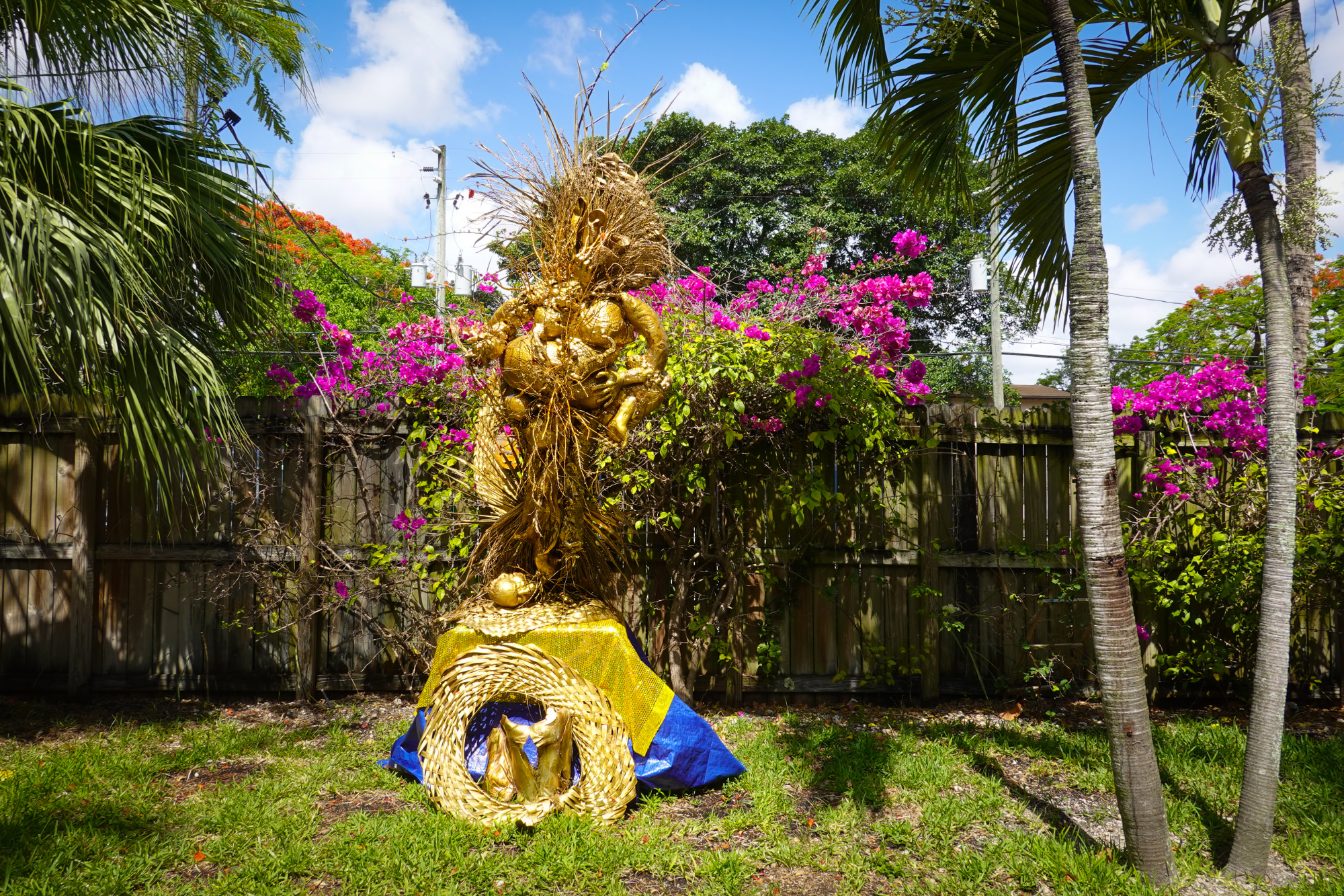 The Mother Mold monuments are fertility effigies created during a full spectrum reproductive and climate health workshop where the artist collaborates with local doulas, botanicas and her LGBTIA+BIPOC neighbors in their domestic habitats. Cast from a combination of pregnant bellies, helping hands and faces, the triptych includes a portrait of the artist combined with her neighbor's birth mask (Catherina Ortiz of Liberty City).