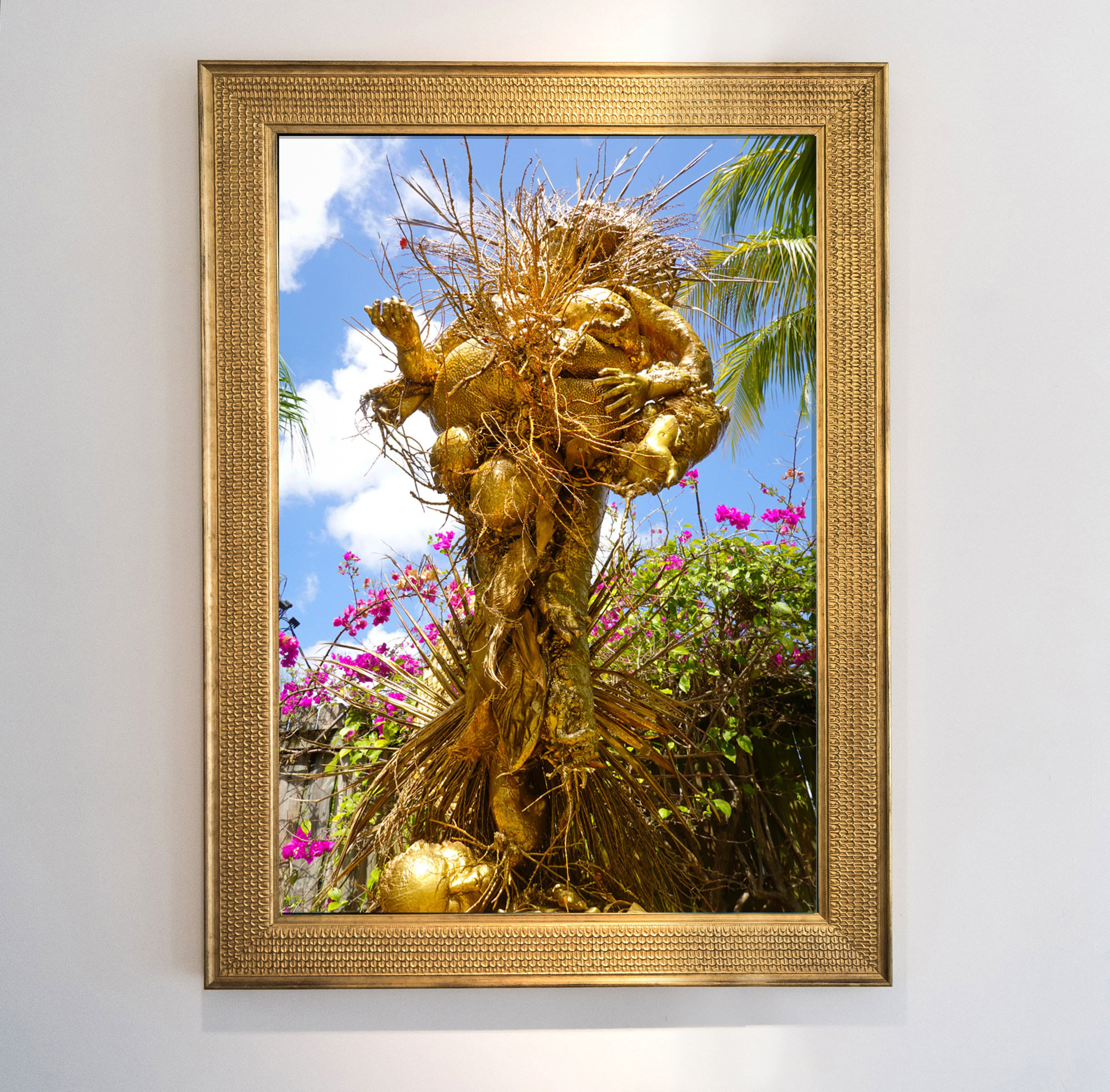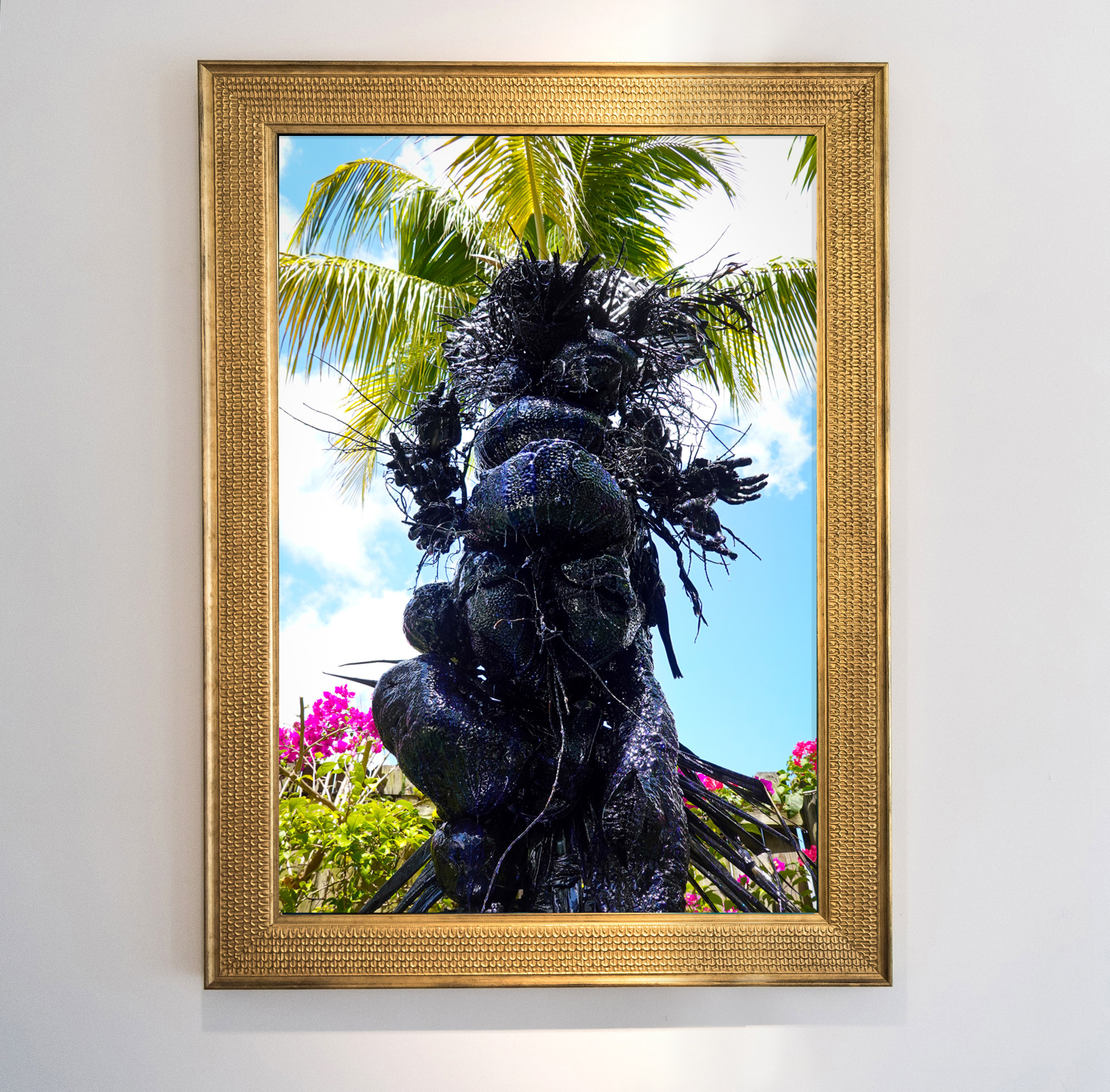 The Coralina Triptych depicts a series of Mother Mold monuments from the Mama Spa Botanica project immersed within a verdant, tropical sanctuary at the Colonial Florida Cultural Heritage Museum in the historically redlined neighborhood of Alapattah, Miami FL. Composed of intimate waste, environmental ephemera cast in domestic construction materials including charcoal, coral, sea sponges, chancletas, woven palm fronds, palm stamens, palm husks, wall insulation foam, building studs, floor resin, industrial adhesive, interior latex paint, landscape marking paint, spray paint, nail salon paint, synthetic hair weave, human hair, fingernails; the works warn and welcome viewers of the effigy figure's survival strategies. The Mother Mold monuments restore divinity and dignity to survivors of conflicting climate and man made health crisis. Historically, the work imagines survival strategies from intersecting forces of global South liberation mythologies and American colonial legacies.