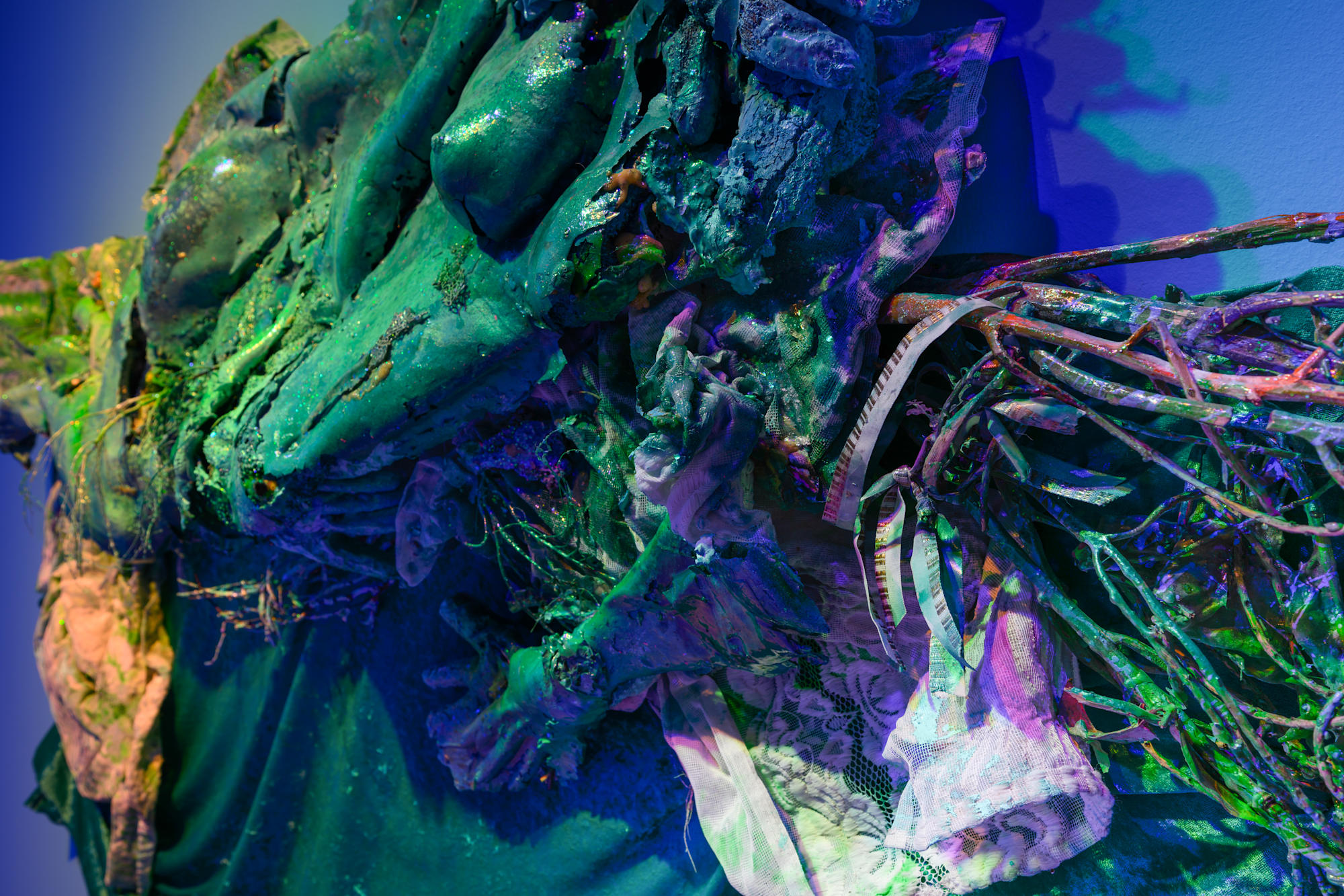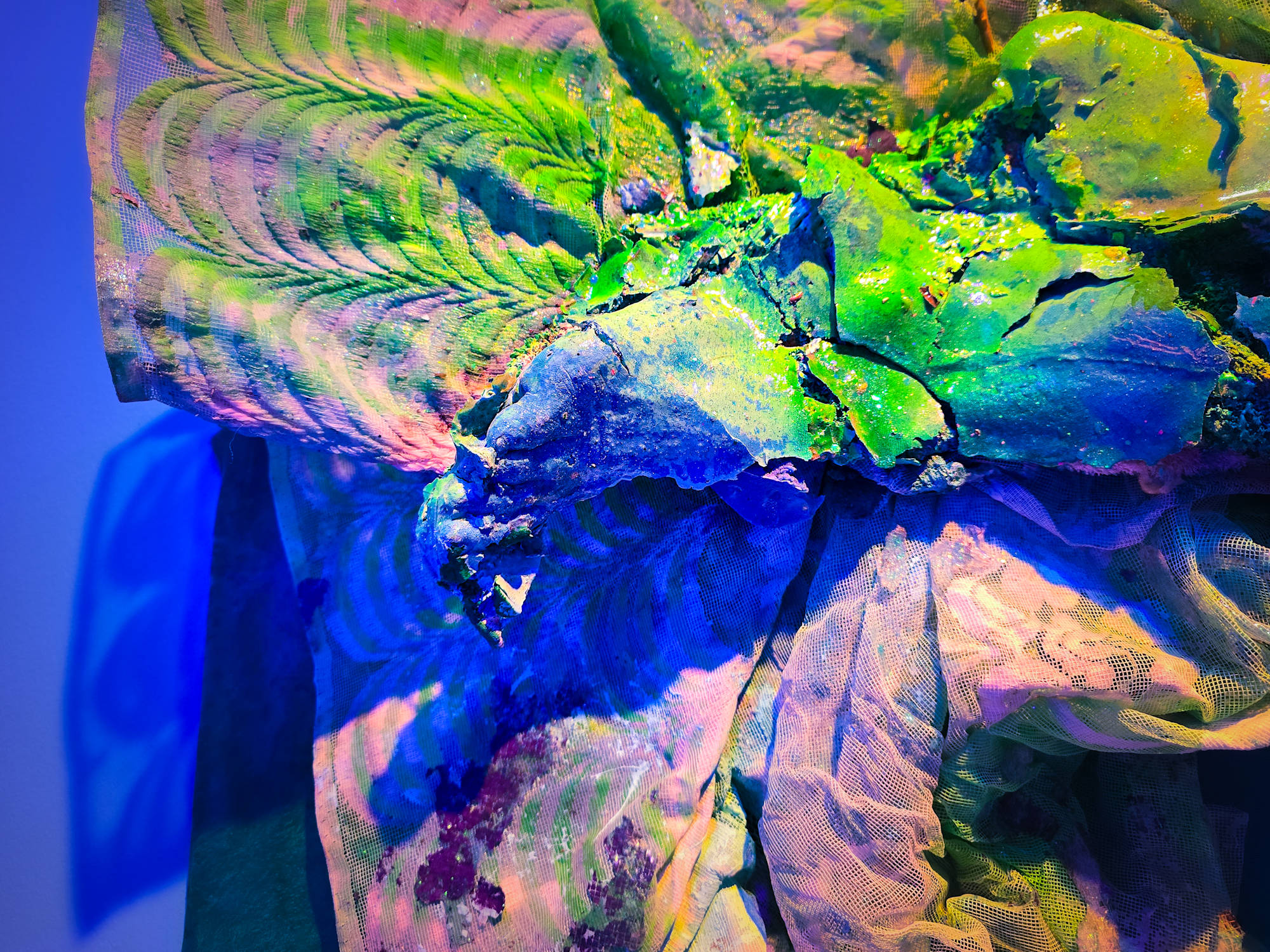 intimate waste, environmental ephemera cast in domestic construction materials including: human hair, coral, sponges, spirit bottles, seeds, Foxtail Palm stamens, used covid medical gloves, construction gloves, condoms, wood stud, neon lace window curtain, sand from Surfside, nail salon glitter, spray paint, exterior house paint, building insulation foam, gypsum plaster, metal lathe, industrial floor resin