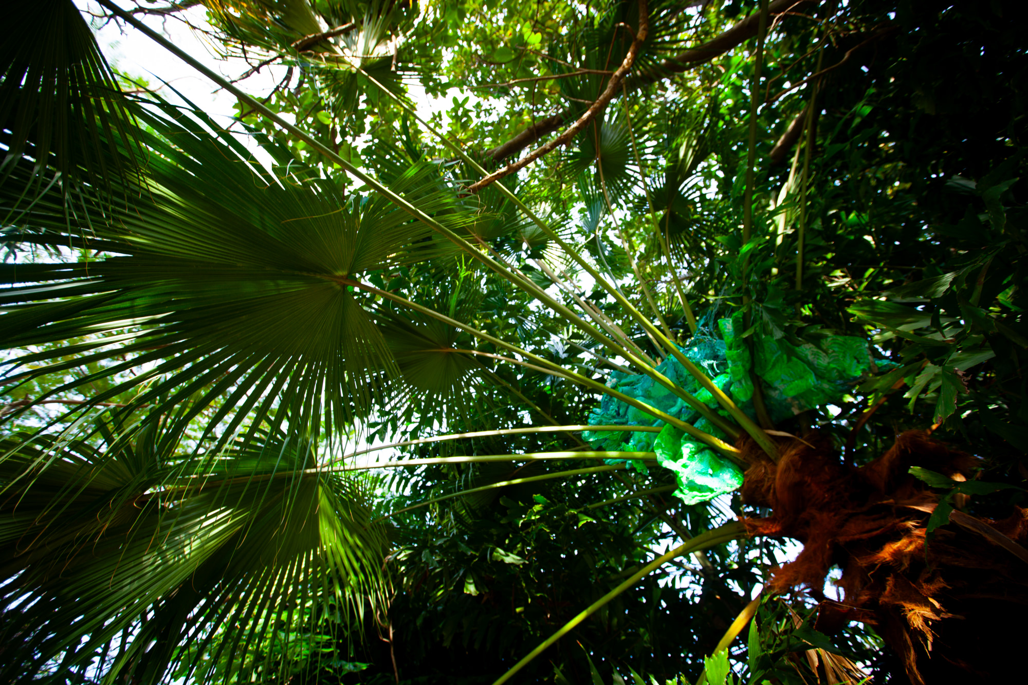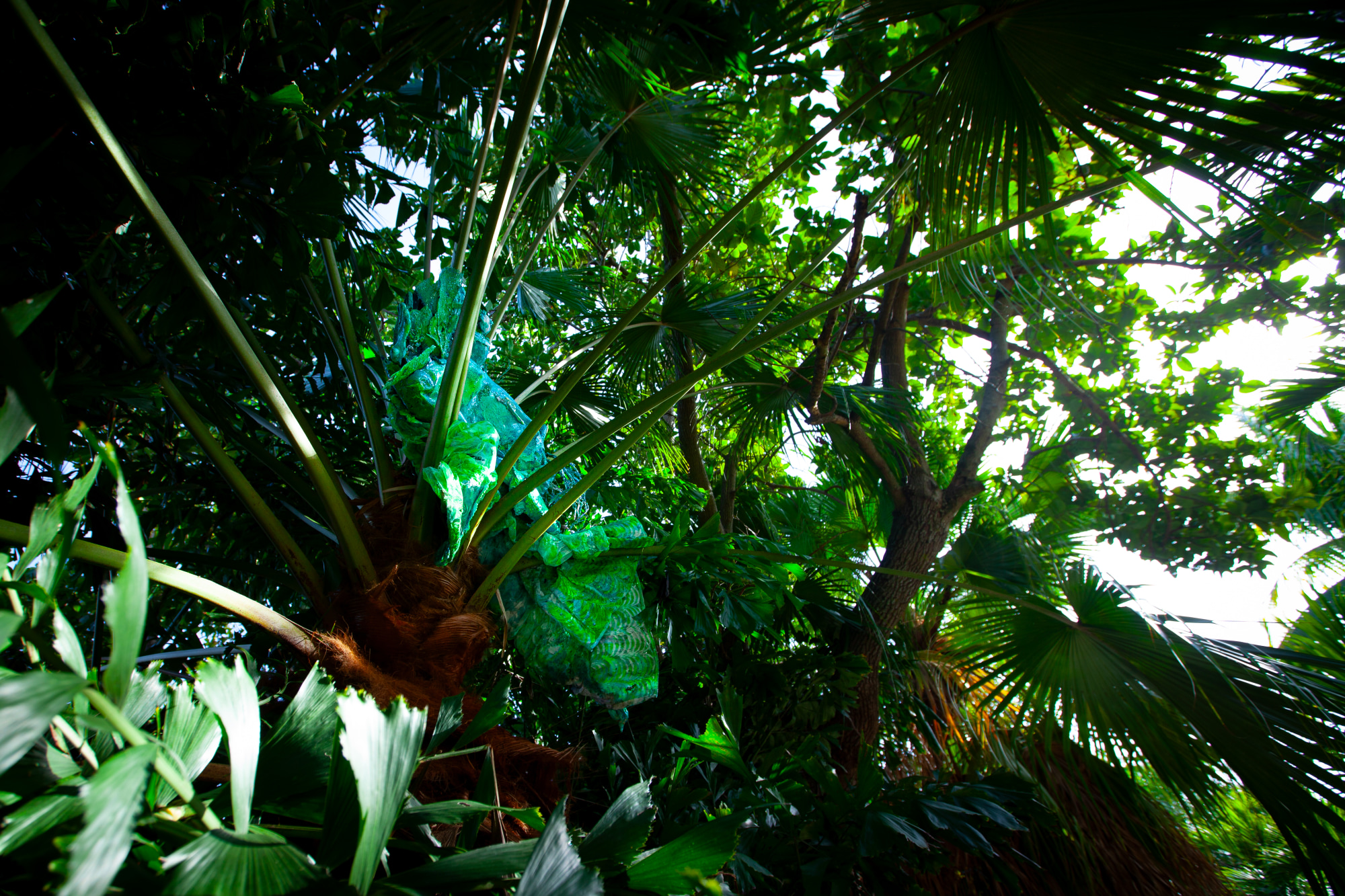 A fertility effigy rests in the palm husks of a Chinese Fan Palm crown within the sanctuary garden at Colonial Florida Cultural Heritage Museum during a solo show of Coralina Rodriguez Meyer's Mother Mold monuments installation for the AIM Biennial Miami 2023-24. A coral cast figure composed of 4 years of collecting trash, intimate waste and environmental ephemera from our respective neighborhoods in South Miami and Miami Beach FL is in repose above the viewer's horizon line, beyond the Catholic Archdioses' art collection in the historically redlined Alapattah Miami neighborhood. The fertility effigy restores dignity and divinity to the refuse materials formed in the shape of a pregnant body whose resting pose and coral texture is wafted by flittering fishtail light. A wet resin surface with iridescent sunlight to restored coral growing from an aqua and lime green reclining figure atop a palm trunk. Recalling the syncretic Yemaya/ Virgen de la Regla deities of the Americas, the figure is visible by the dangling foot, belly and breast between frond stems and the splintered sky.