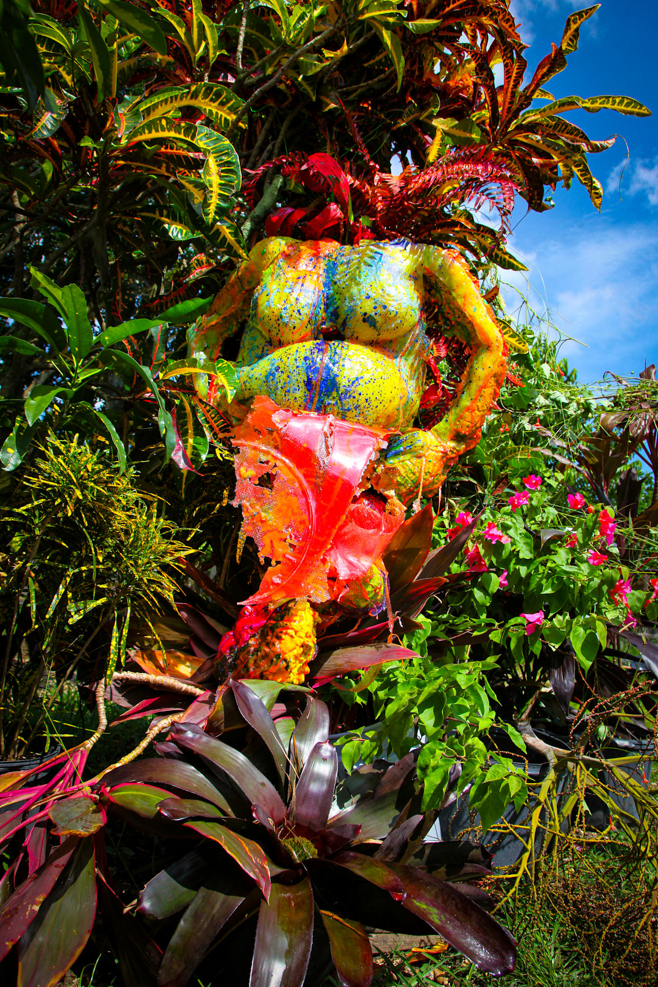 Fruta Extraño (Neon Colored Girl Diptych) depicts a vibrant fertility effigy amidst a hammock of Croton foliage under an August Miami sun. The Virgen Gruta syncretic figure depicted in its endemic habitat, is a resin cast pregnant body, with a cobalt blue spray of Linea Negra dividing the figure into two hemispheres. Beneath the kaleidoscopic surface is a jackfruit texture and exotic plant casts. Jackfruit sap is used in ancient reproductive medicine to induce labor (nature's pitocin), can be applied as a coagulant to treat wounds, or in certain doses, used to abort a fetus. Extending the gestational power of the Linea Negra, the sculpture reclaims vernacular portraiture and ancestral narratives to illuminate polychromatic Global South mythologies.