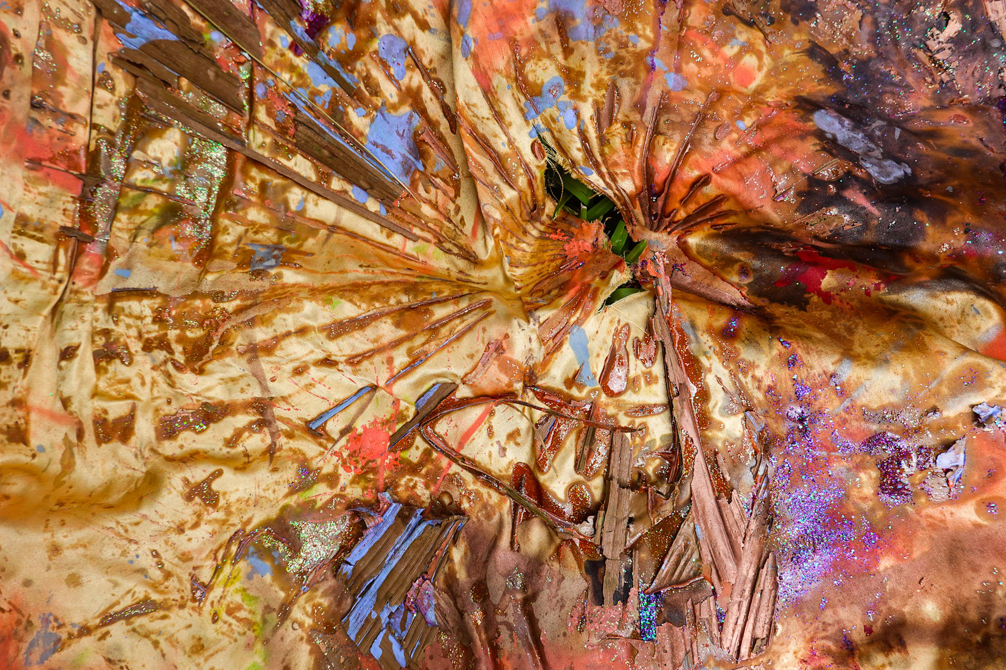 A fertile gold glowing light emanates from a textured surface of cast palm fronds resembling petrified Earth. Peeled away cast paint reveals a prismatic surface of tropical botanica beneath sedimentary layers of glitter, latex house paint, spray paint and acrylic. The painting on bedsheet celebrates divine, mournful rest with the ancient Andean myth of Kuychi whose rainbow is an auspicious, yet mournful symbol for the sun diety's petrified son.