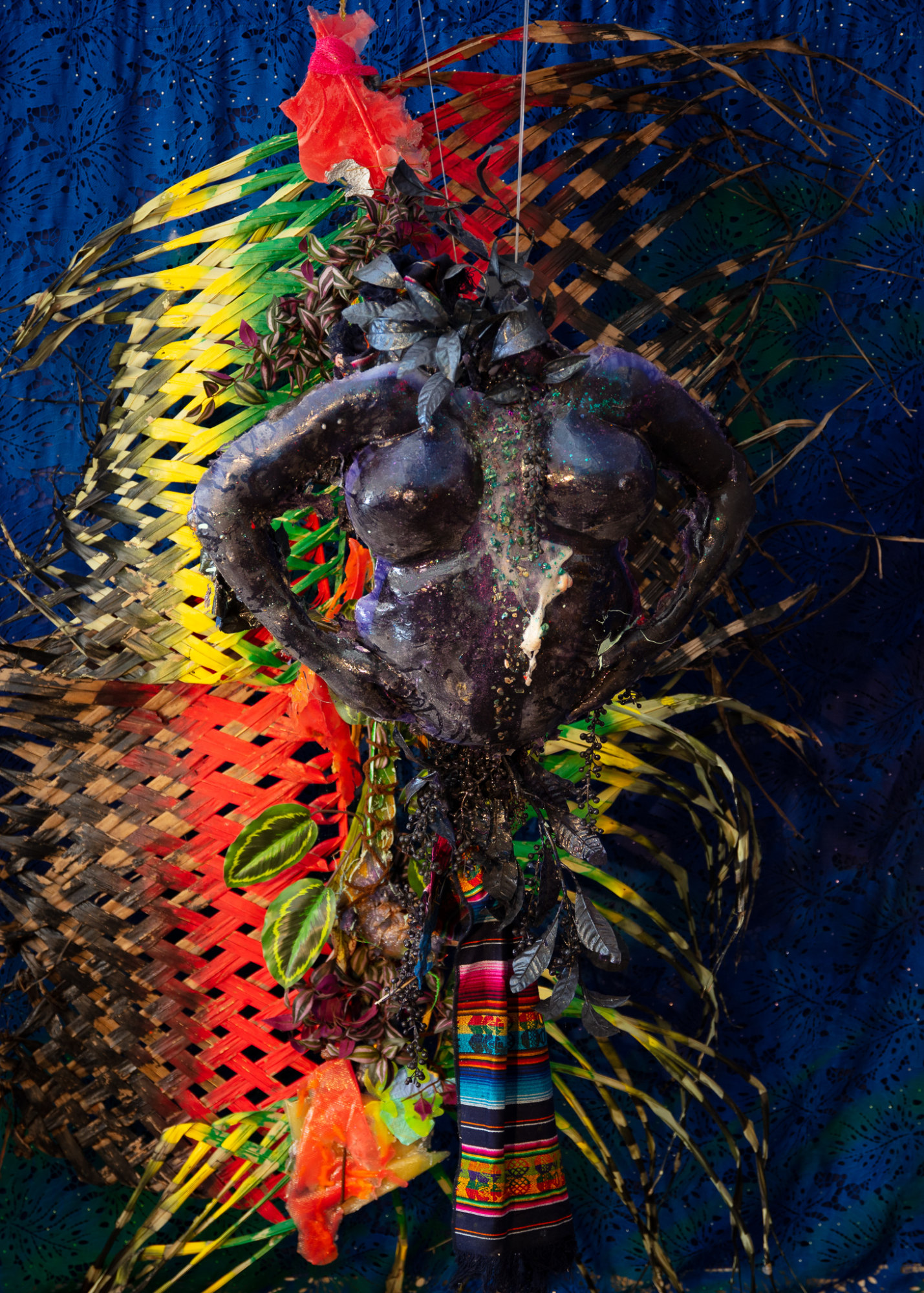 Luna Negra obscures a slurry of intimate ephemera and environmental waste into a cast of domestic construction materials. A discarded fruit sack veil serves as a surgical mesh for the artist's purple face, nested within the uterus of a blackened, pregnant body cast with tropical foliage and fake funerary flowers. A vintage Mexican serape drizzles periwinkle liquid through the figure's backbone, emerging as a loincloth from it's birth canal. Reflecting on the life and death cycles depicted in ancestral liberation mythologies, the extant is simultaneously a figure and a landscape alarming and alluring the viewer with Flora Auras palm weavings reminiscent of Equatorial carnival celebrations, and mummification rituals. The second layer of the fertility votive figure has a translucent glow-in-the dark resin that conjures moonlight reflecting on the ocean: an eerie reminder of the irregular tides of tropical gentrification that threaten Miami's most vulnerable neighborhoods populated by Black and Brown families.