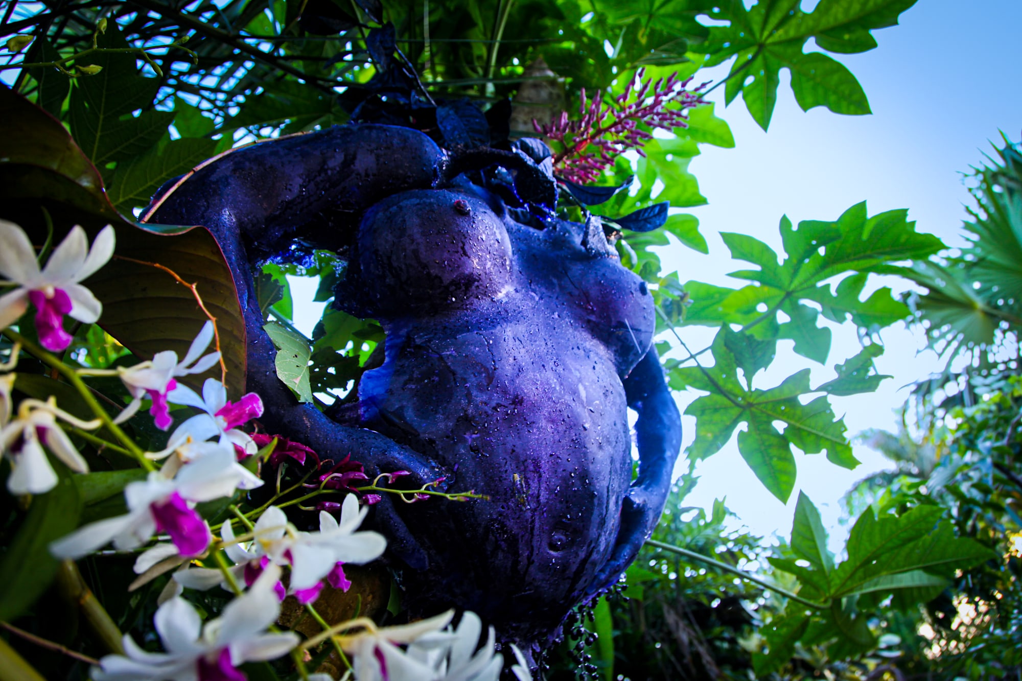 Luna Negra (Velas Negras Homestead Everglades) or Black Moon (Black Sails Homestead Everglades) obscures a slurry of intimate ephemera and environmental waste into a cast of domestic construction materials. A discarded fruit sack veil serves as a surgical mesh for the artist's purple face, nested within the uterus of a blackened, pregnant body cast with tropical foliage and fake funerary flowers. Emerging as a loincloth from it's birth canal, a vintage Mexican serape drizzles periwinkle liquid through the figure, reflecting the overcast sky beyond. Reflecting on the life and death cycles depicted in ancestral liberation mythologies, the sculpture is simultaneously a figure and a landscape alarming and alluring the viewer to the travails of Global South fertility. The diptych is an extant retablo within its endemic, tropical habitat. The materiality of maternity conjures moonlight reflecting on the ocean: an eerie reminder of the irregular tides of tropical gentrification that threaten Miami's most vulnerable neighborhoods populated by Black and Brown families.