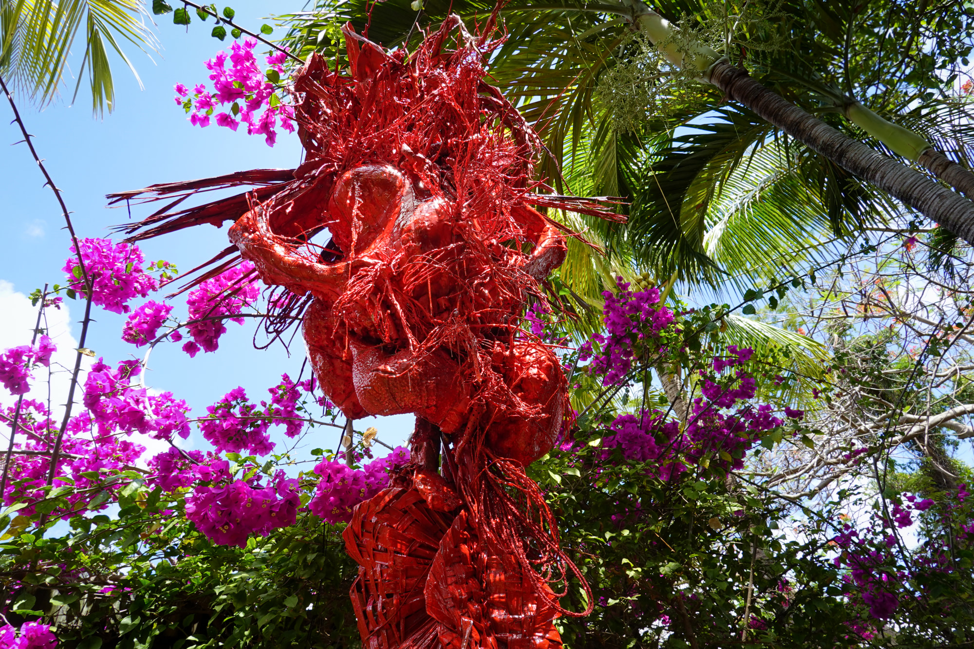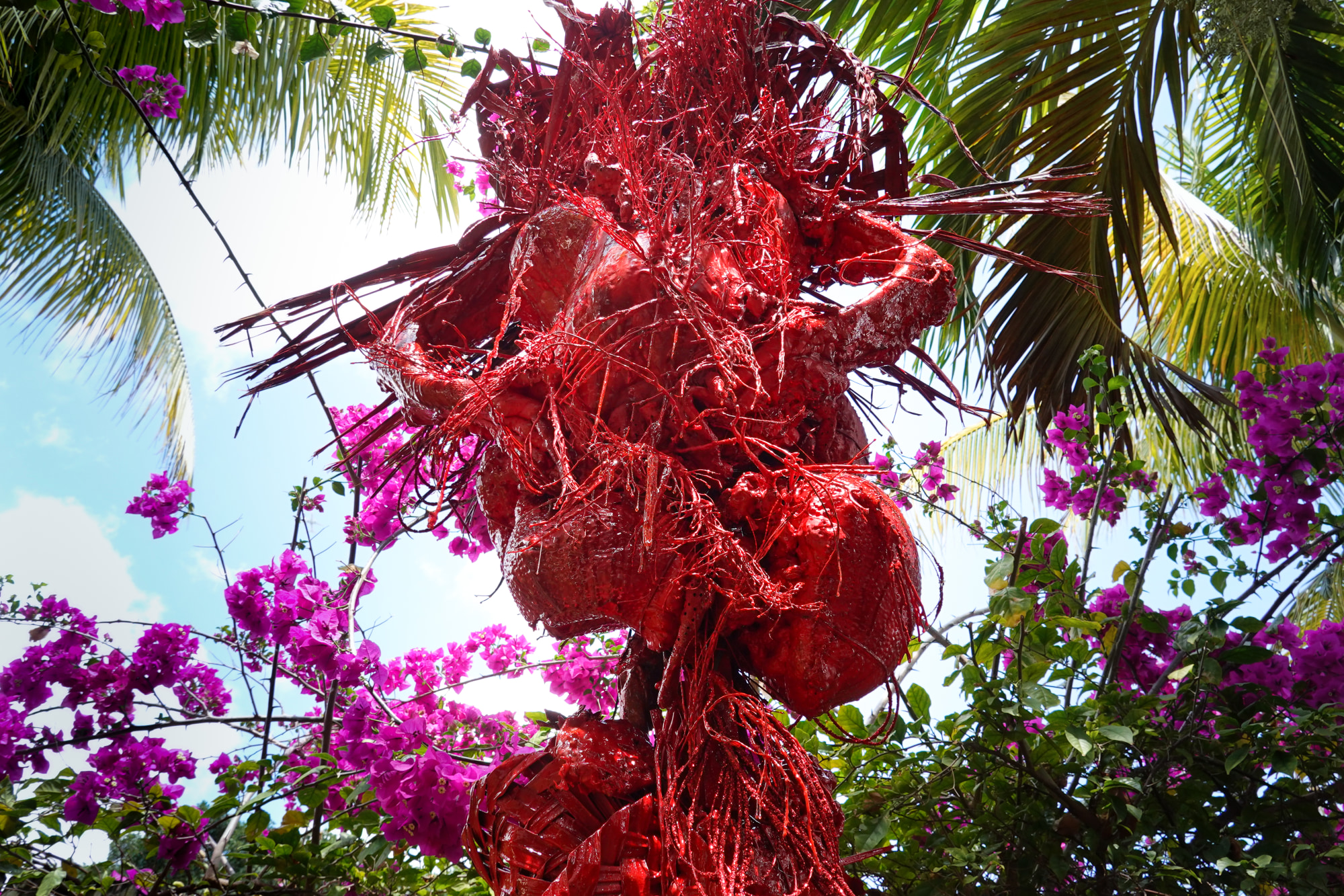 Mar Sangria artist created after collecting littoral litter for 4 years along the seashore in Miami beach with her daughter. Dead coral, sponges, chancletas, palm husks, palm stamens shells and straws are among the refuse ingredients in the sculpture the artist refers to as "gifts from Yemaya" that were reclaimed after climate pulses including hurricanes, tropical storms and moon tides.