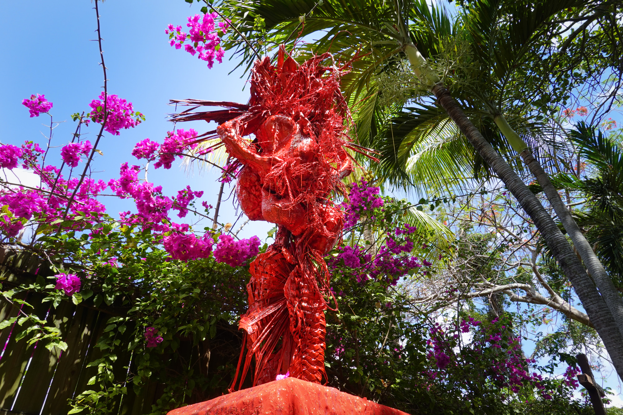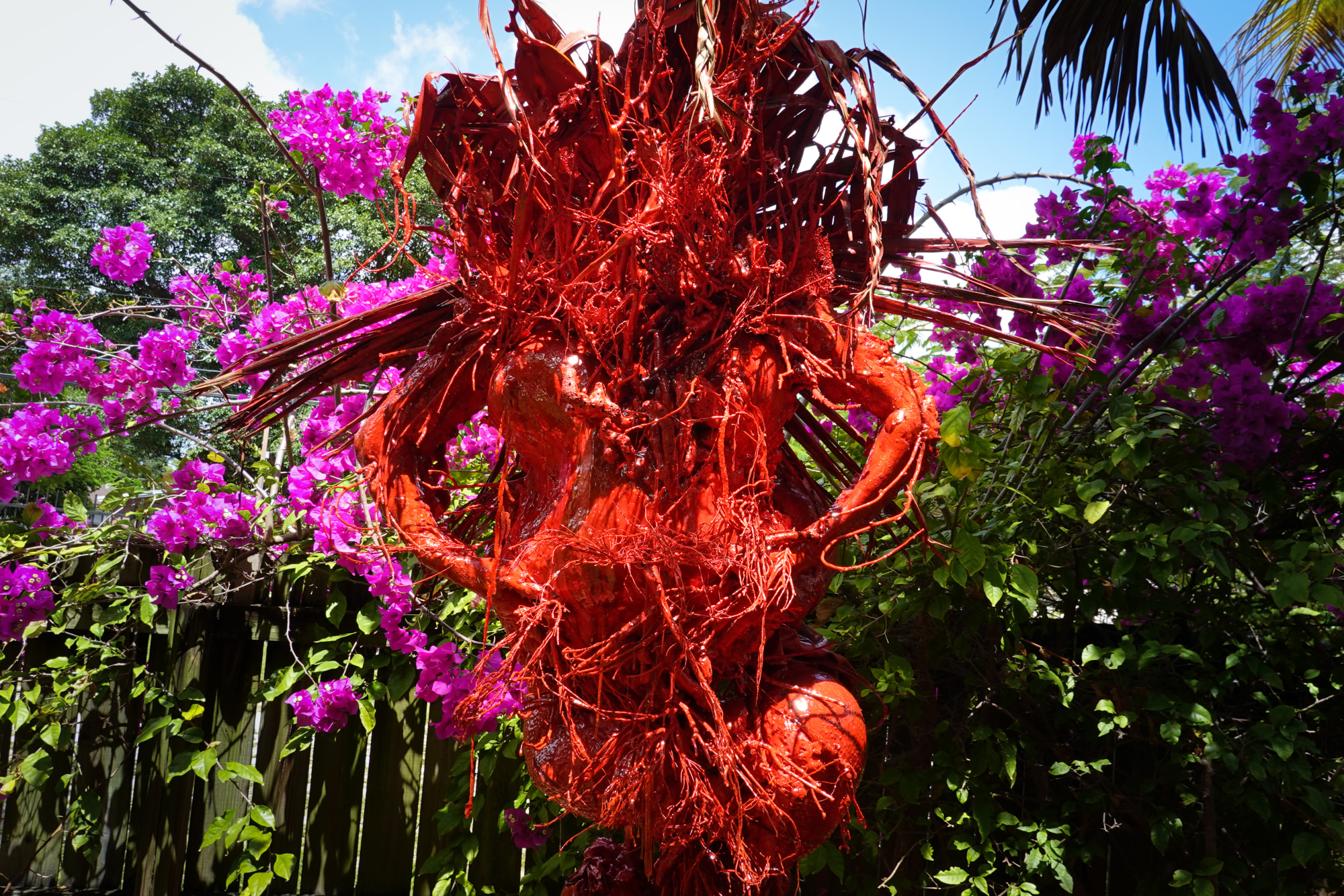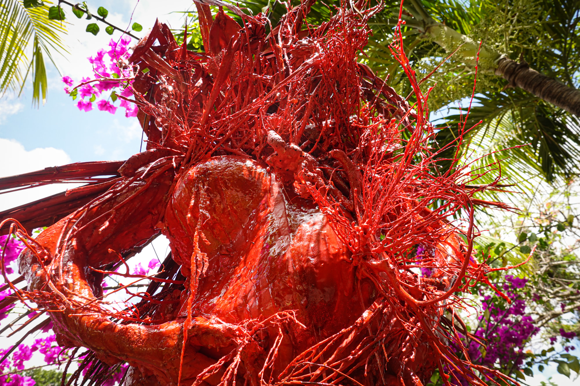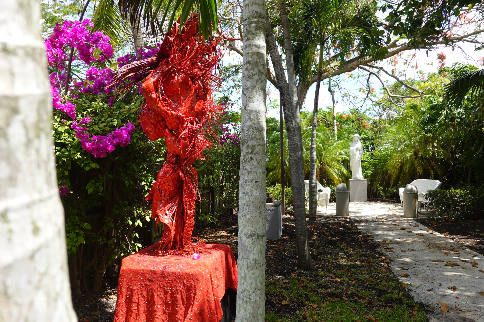 Mar Sangria is a procreative effigy figure composed of intimate waste, environmental ephemera and domestic construction materials grotesquely arranged in sedimentary layers of fire coral red. Translated from Spanish, Mar Sangria is River of Blood/Wine a syncretic reference to the Catholic archdioses collection where the artist's Inca, Moche and Andean ancestor's fertility effigies are housed. Part of a site specific installation "Coralina triptych" at Colonial FL Cultural Heritage Museum responds to the collection of colonial spoils from the artist's heritage, including a Mother Mary white marble figure shaded by a Flan Boyan Royal Poincietta tree. The work reclaims a Catholic rosary originating in indigenous Caribbean and Andean mythology.