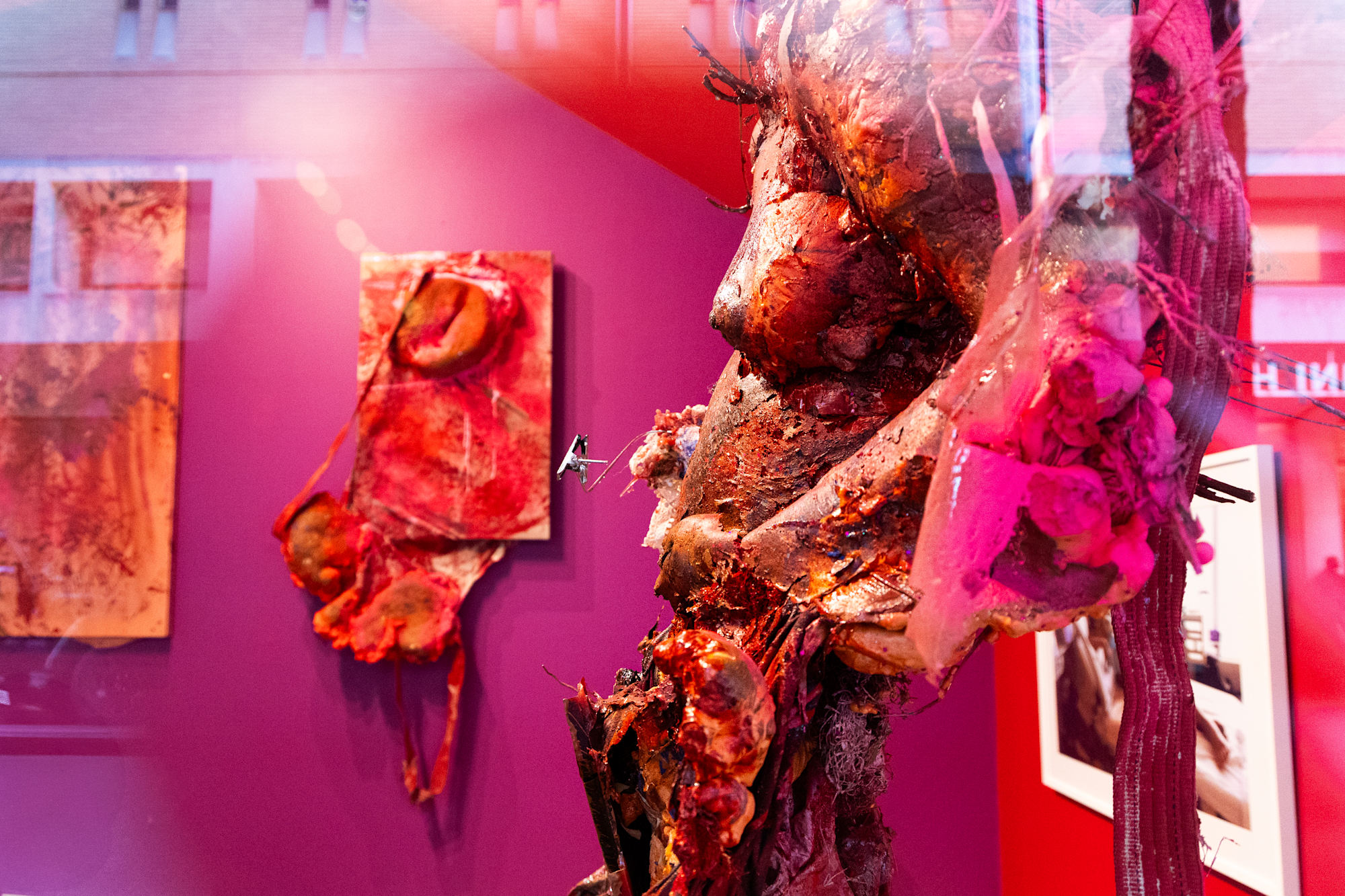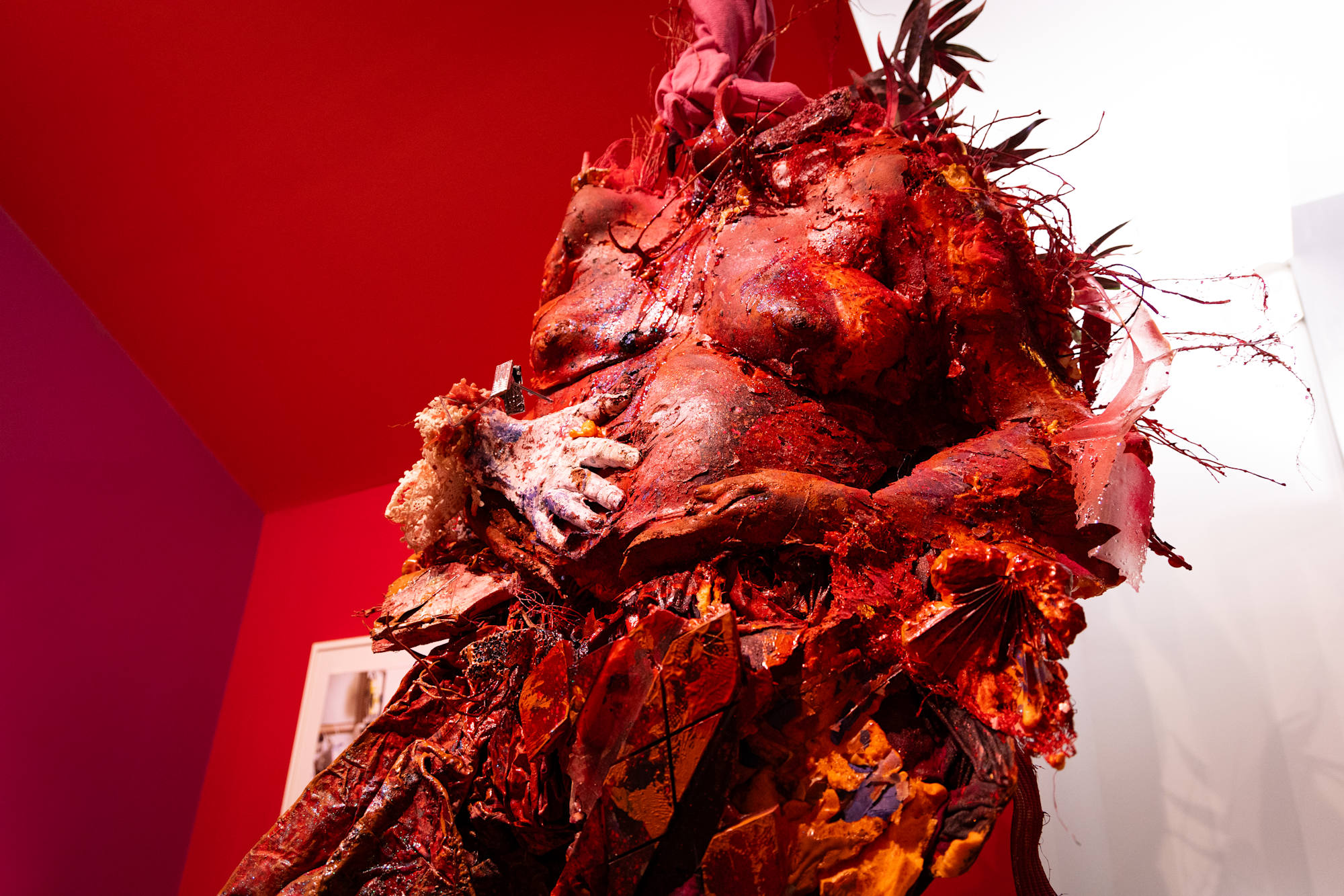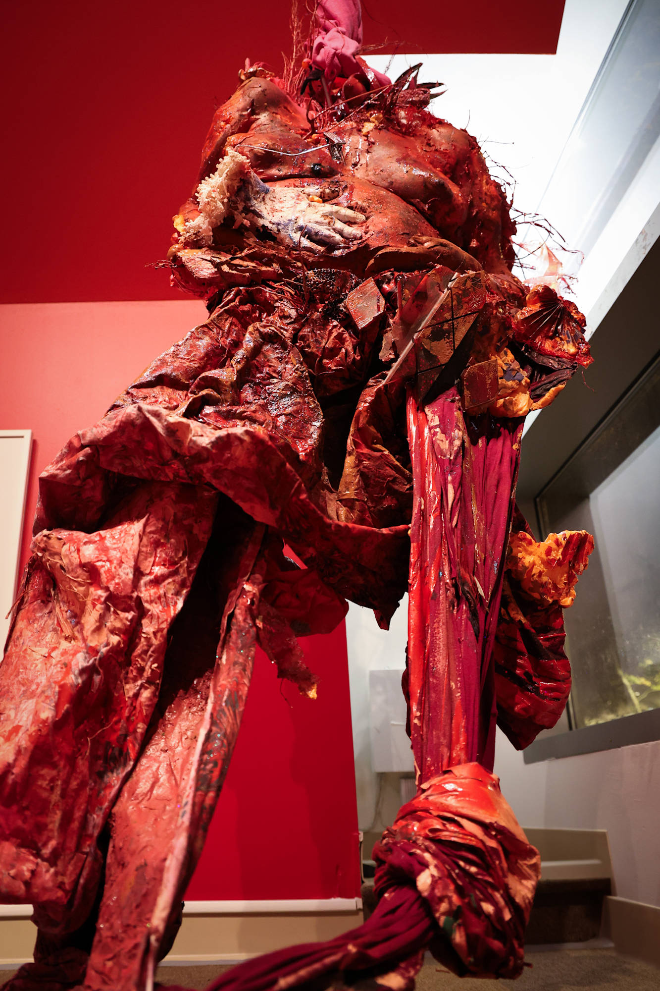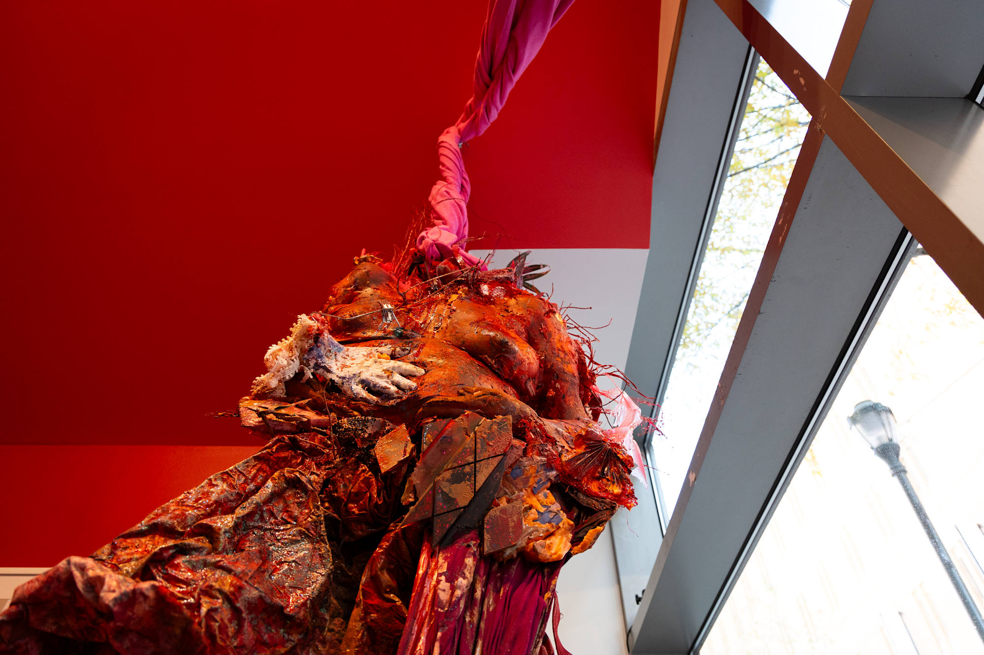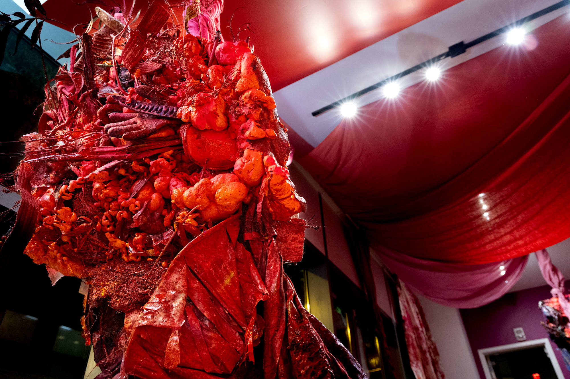 Red Eyes, Twilight Irises, Dawn Pupils, White Stars confronts street vouyuers along a historic surgical theatre in Iris Crepusculos Pupilas Madrugadas solo show at Thomas Jefferson University medical school, a fire coral red and flesh tone Mother Mold fertility effigy suspends from the ceiling with umbilical twisted, fuchsia drapery fabric nesting onto a backbone of coral, wrapped in serape textiles, preserved with plastic funerary flowers, woven palm fronds, cast coral, birth control pill packs, and Flan Boyan seed pods cast in domestic construction materials.
