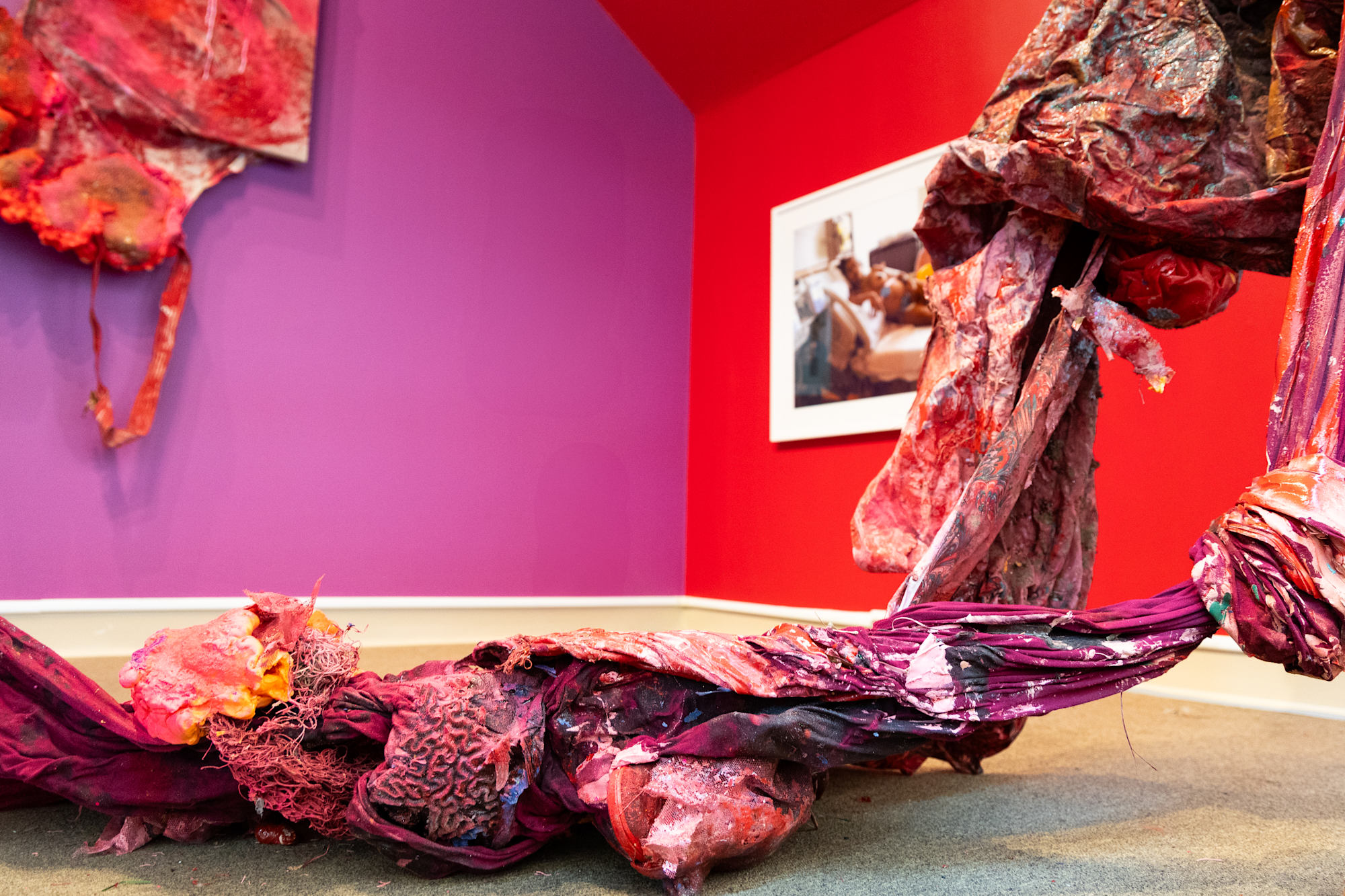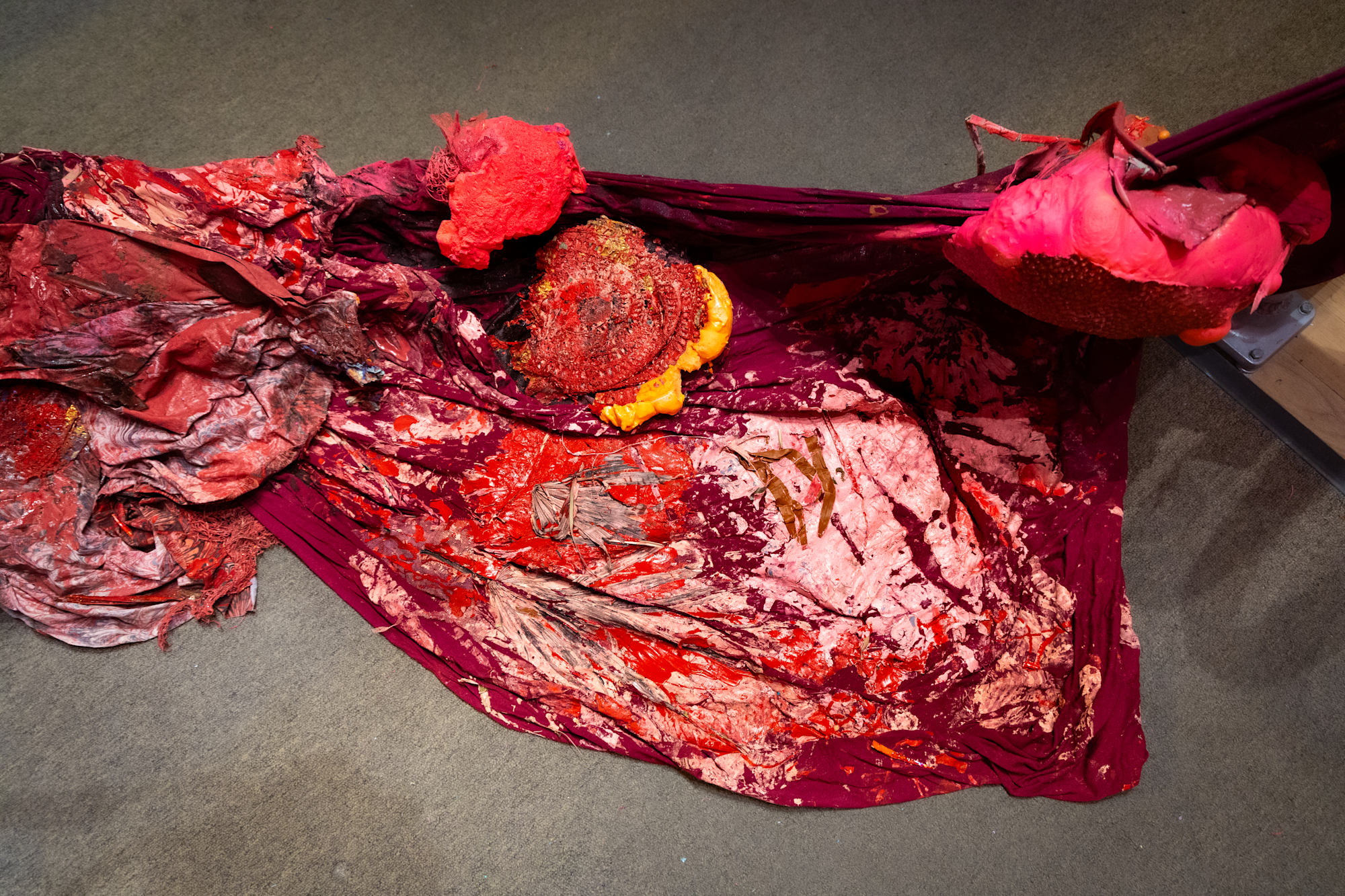 Architectural length serapes envelop the ceiling, windows and handrails emerging from a cast figure of foliage, flora and landscape debris to form a spiraling, grotesque fertility effigy. Levitating above the afterbirth of a sangria colored fabric cast into a Flora Aura painting of coral, palm fronds and twisted seed pods billowing onto the floor of the historic surgical theatre at the medical college. A reincarnated figure examines the institution's legacy through the Mother Mold monument and Flora Aura reconstruction of Thomas Eakins' Gross Medical Clinic painting commissioned by the University. Hovering above the stigmatized, sterilized university legacy, the Mother Mold monument renders the figure as a reliquary, levitating above the grotesque medical college history of operating on formerly enslaved cadavers. Intertwined shoe laces, little girl's petticoat lace and a metal coat hanger billows from Gross's white hand gripping the clay colored pregnant belly, are mournful signifiers of his pediatric sexual abuse. Heavy, twisting red fabric is textured and cast in figurative, scintillating glitter, darkened coffee grounds, soil and clay colored paint. The scarlet figure is interwoven into an amniotic braid; conjoined with an ascending, purple figure that balancing it with carnivalesque, fruitful and transcendent hues.