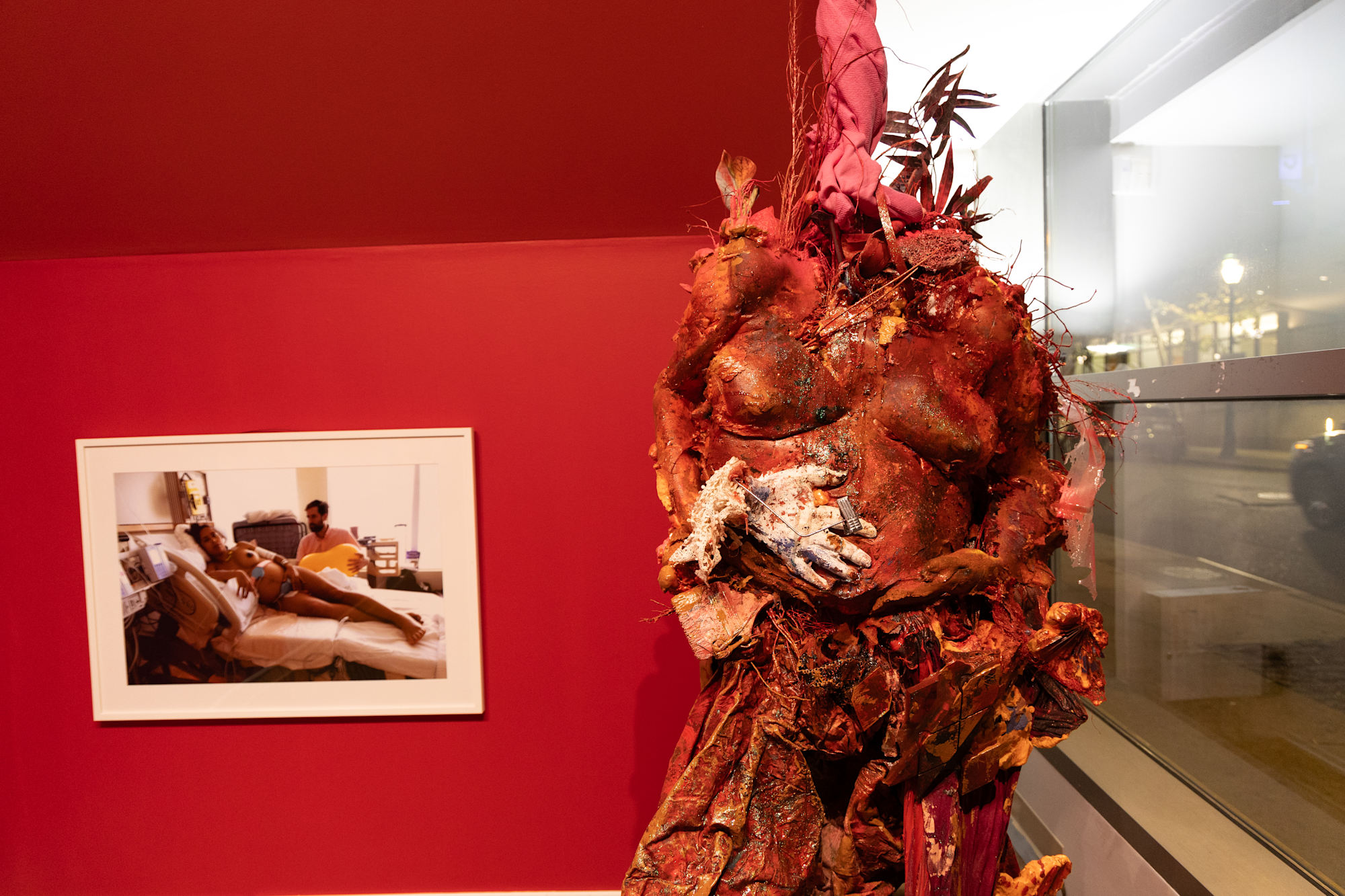 Red Eyes, Twilight Irises, Dawn Pupils, White Stars confronts street vouyuers along a historic surgical theatre in Iris Crepusculos Pupilas Madrugadas solo show at Thomas Jefferson University medical school, a fire coral red and flesh tone Mother Mold fertility effigy suspends from the ceiling with umbilical twisted, fuchsia drapery fabric nesting onto a backbone of coral, wrapped in serape textiles, preserved with plastic funerary flowers, woven palm fronds, cast coral, birth control pill packs, and Flan Boyan seed pods cast in domestic construction materials.
