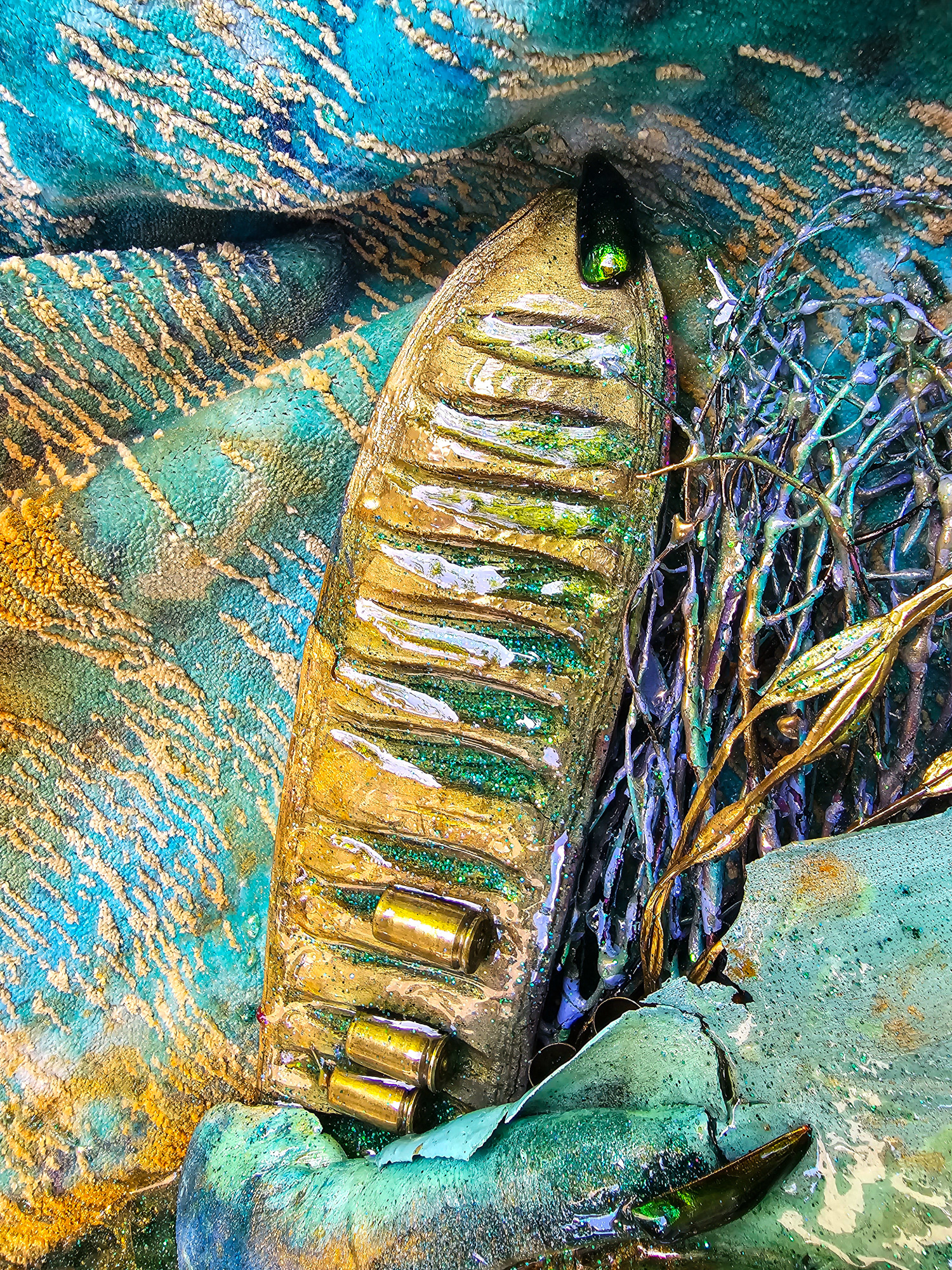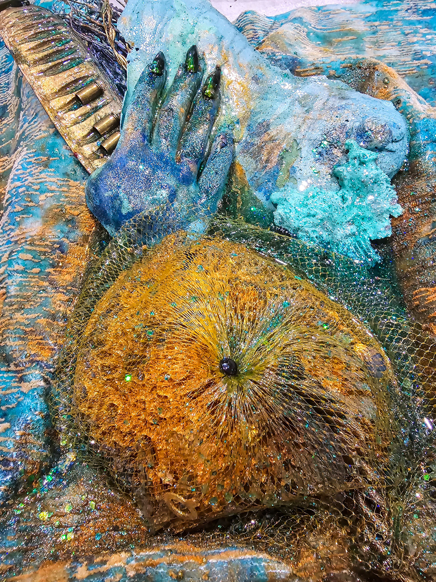 Documentary sculpture & photography intimate waste & environmental ephemera cast in domestic construction materials onto Flora Aura painting including: flamboyan seed pod, spent brass bullet casings, drapery cord, gold pigment, fruit net, coral, beetle wings, upcycled funerary flora, nail salon glitter, industrial floor resin on interior upholstery fabric