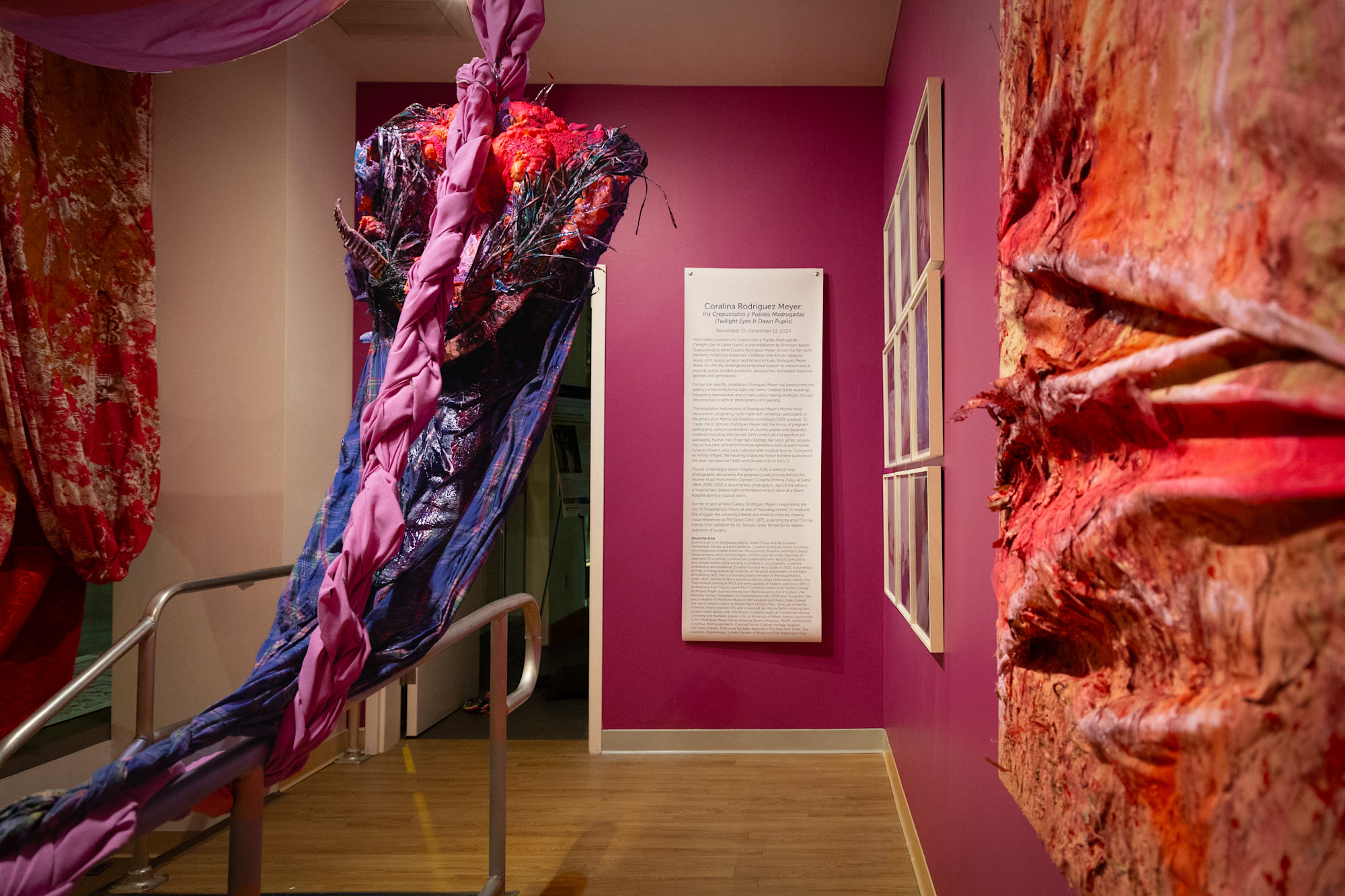 A Mother Mold monument cast of Lauren Bishop and Stevenson Dunn from Bedstuy Brooklyn, depicts the first family of Muslim faith to be cast in the Mama Spa Botanica workshop May 2023. Confronting viewers within a historic surgical theatre in Iris Crepusculos Pupilas Madrugadas solo show at Thomas Jefferson University medical school, a Mother Mold fertility effigy suspends from the ceiling with umbilical twisted, flesh pink fabric nesting onto a backbone of coral, banana stalk casts and fruit nets.
