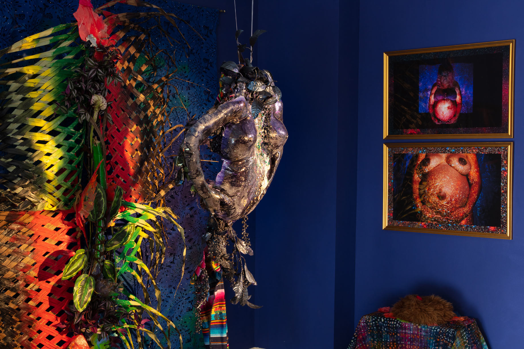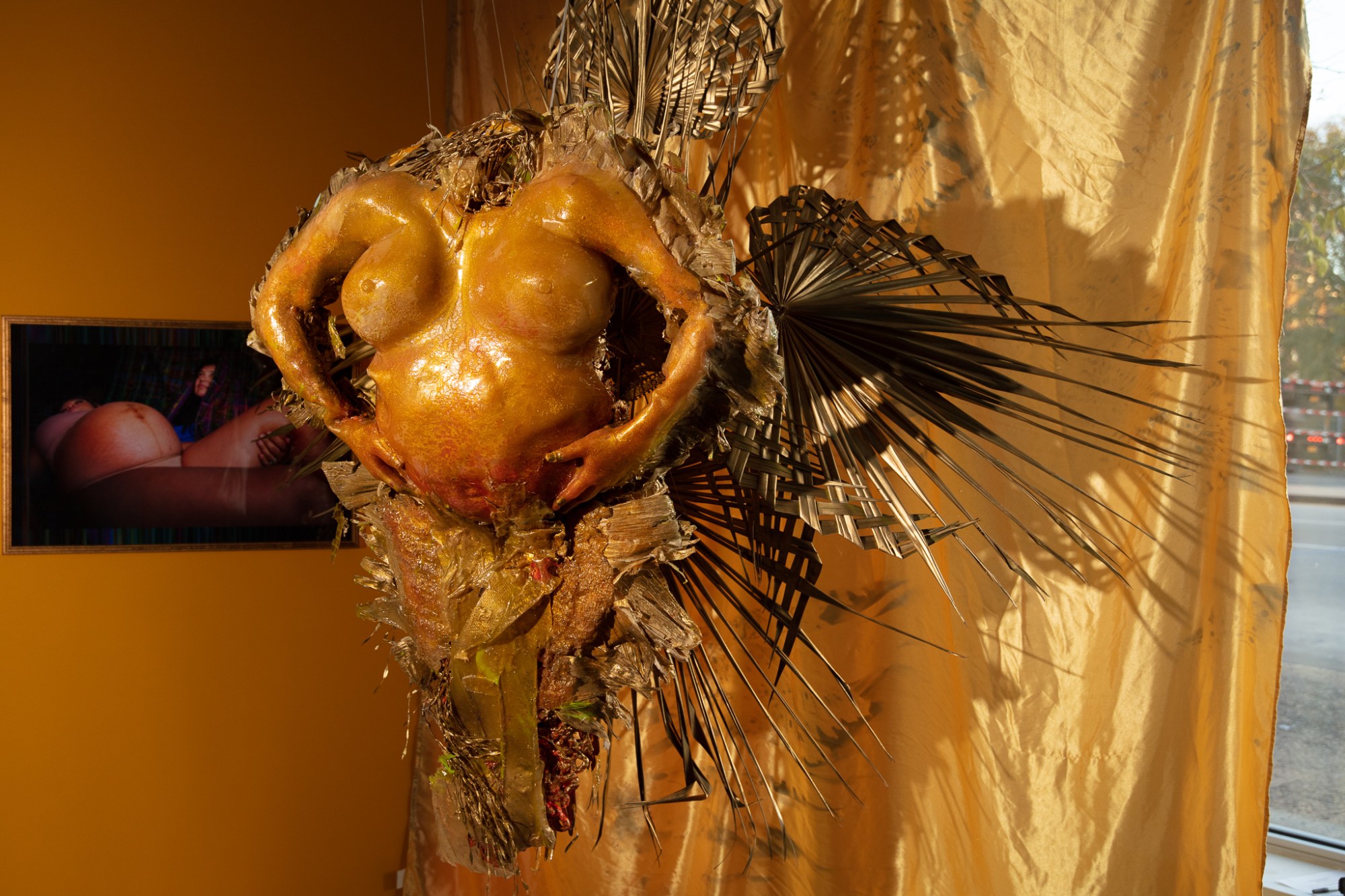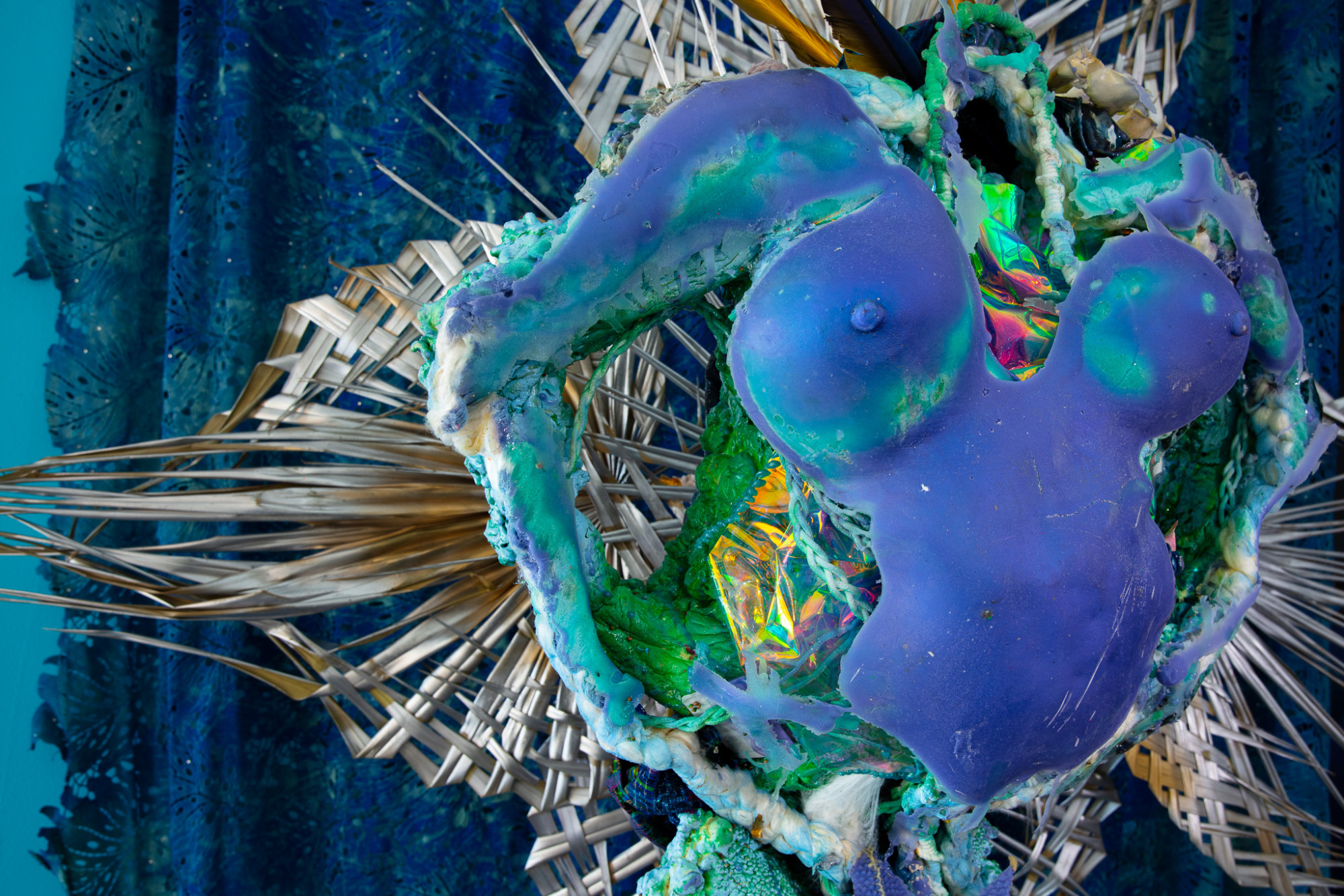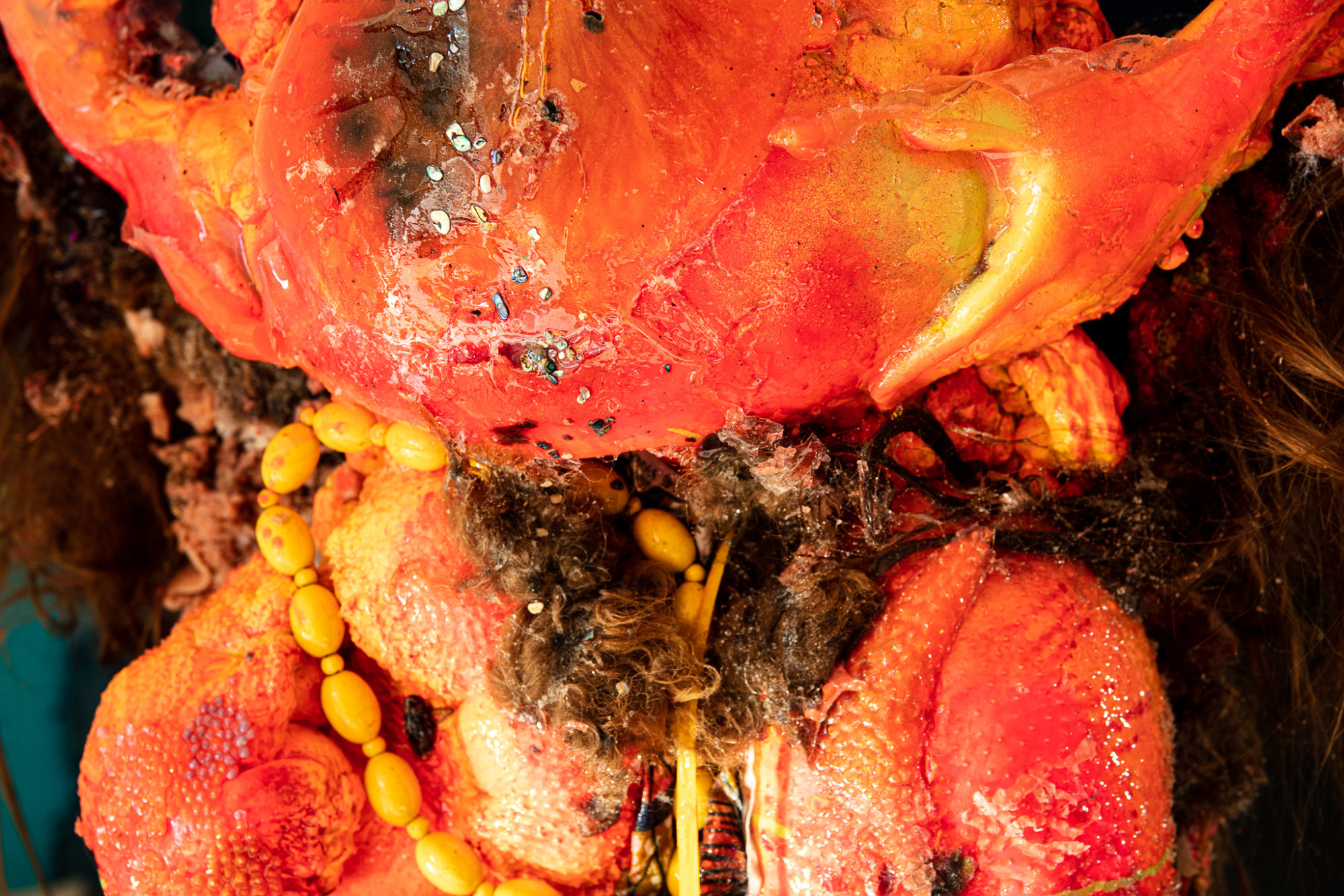 Together, the sculptures and photographs represent Rodriguez Meyer’s cultural translation of the legacy of institutionalized and biological violence in the artist’s biographical community. Built with a maternal healing recipe and identity construction materials, the Mother Mold sculptures formalize the intersections between the maternal health crisis and climate change. The cumulative impact of land seizures and development projects, as well as the accelerated extraction of natural resources in the last five hundred years has forced millions in the Global South to abandon millinery traditions for military medicine. In response, Rodriguez Meyer builds monuments to mixed motherhood that present intimate ephemera and environmental waste as powerful monuments of survival. The sculptures are bound by biological and biographical family remains; bathed in resin, painted with fruit, housed in palm or corn husks, insulated by hair, tucked in sea debris, and braided with palm fronds.